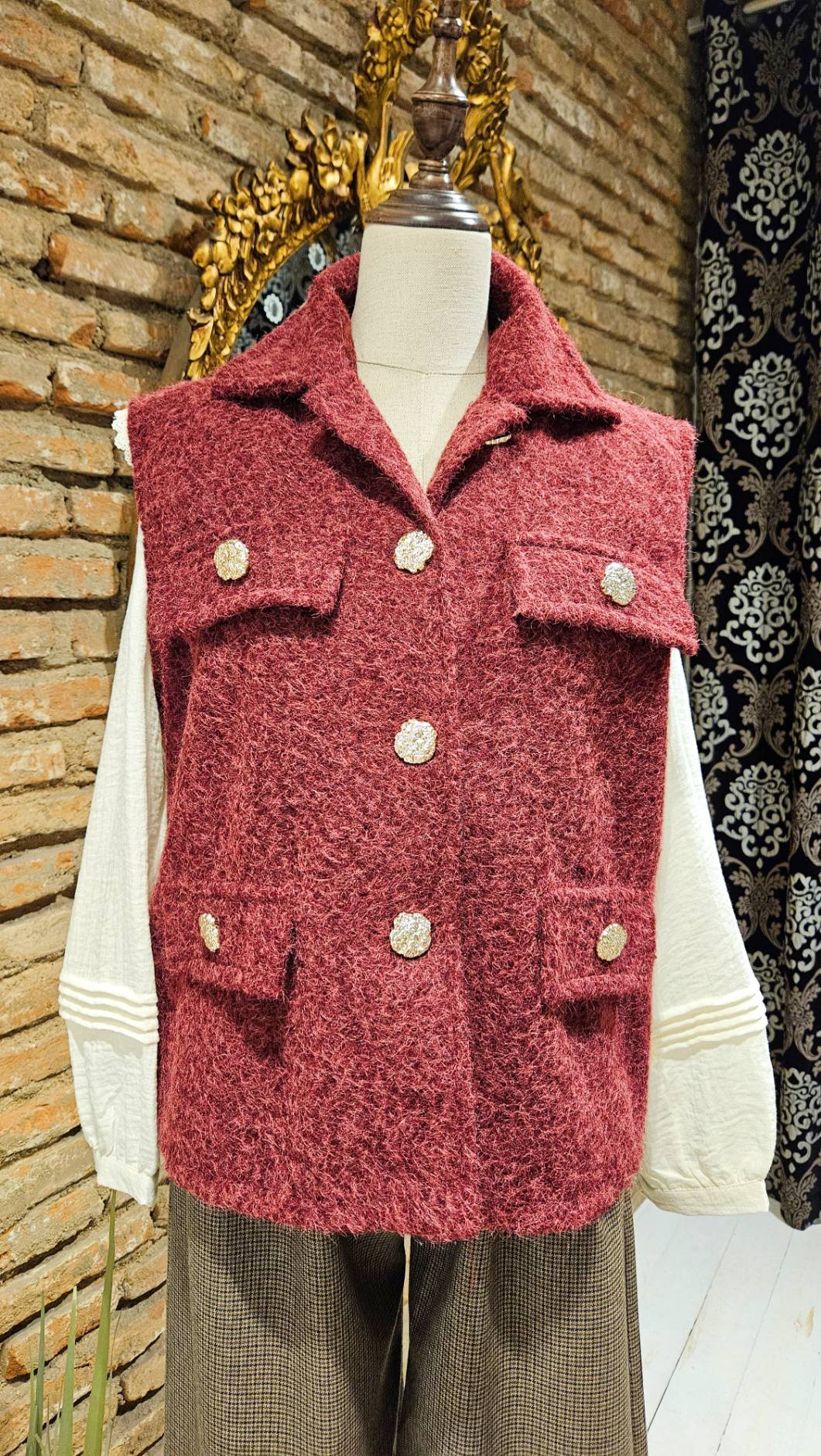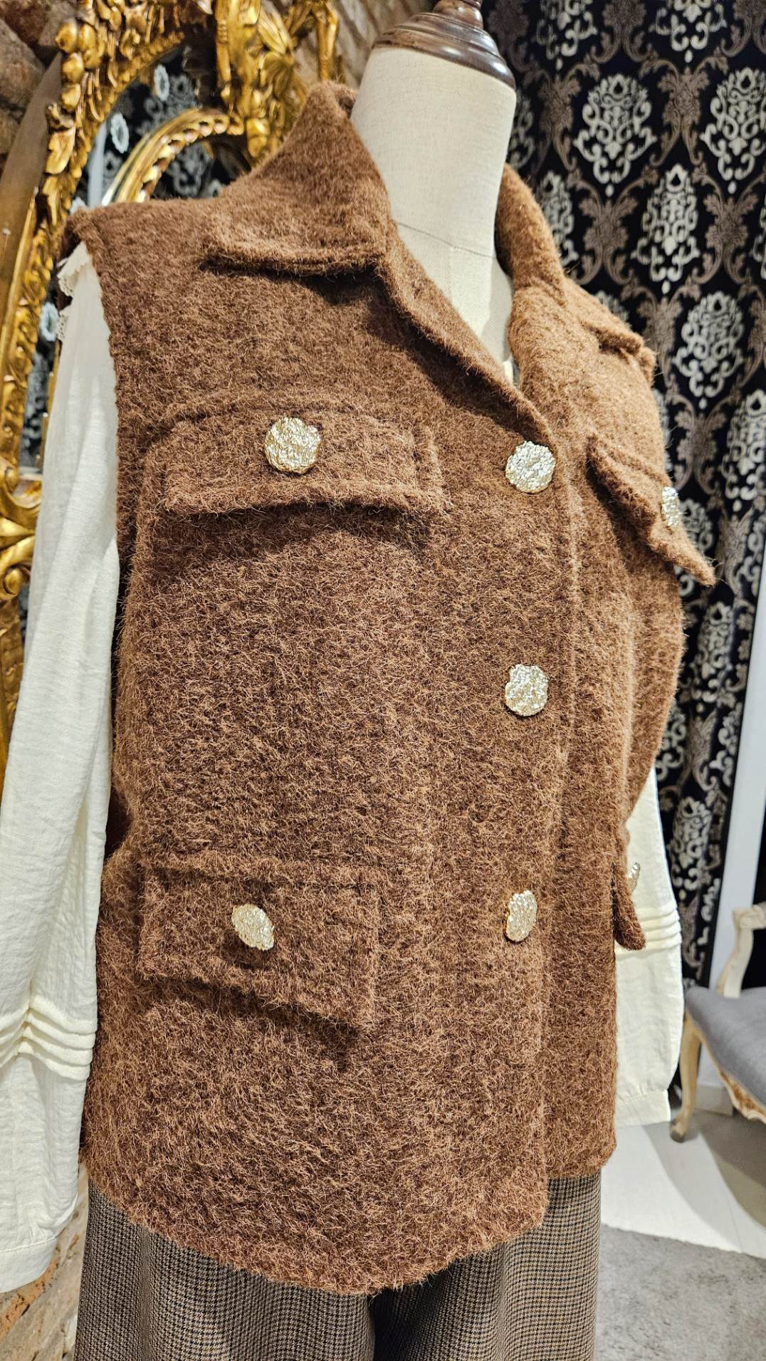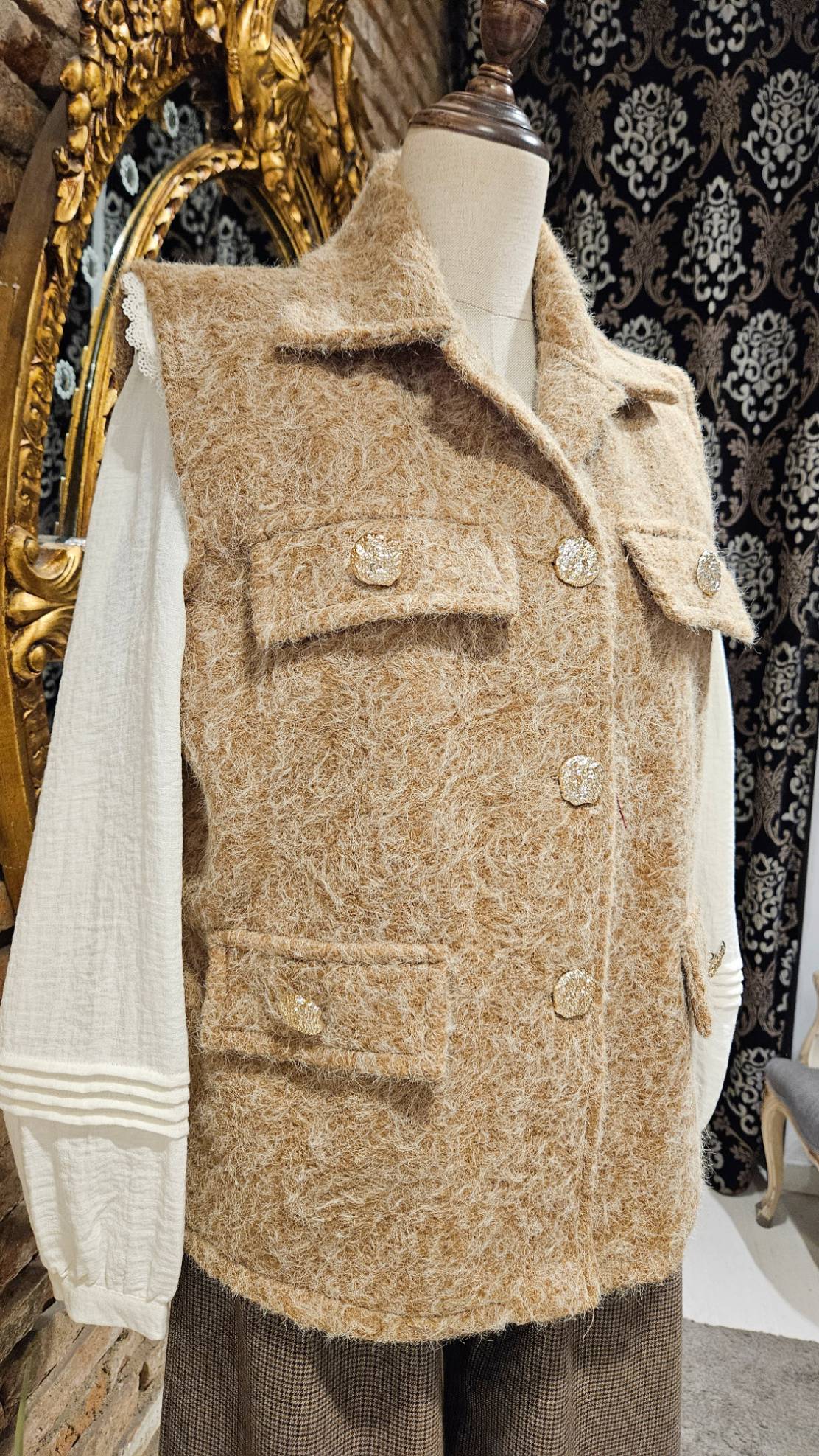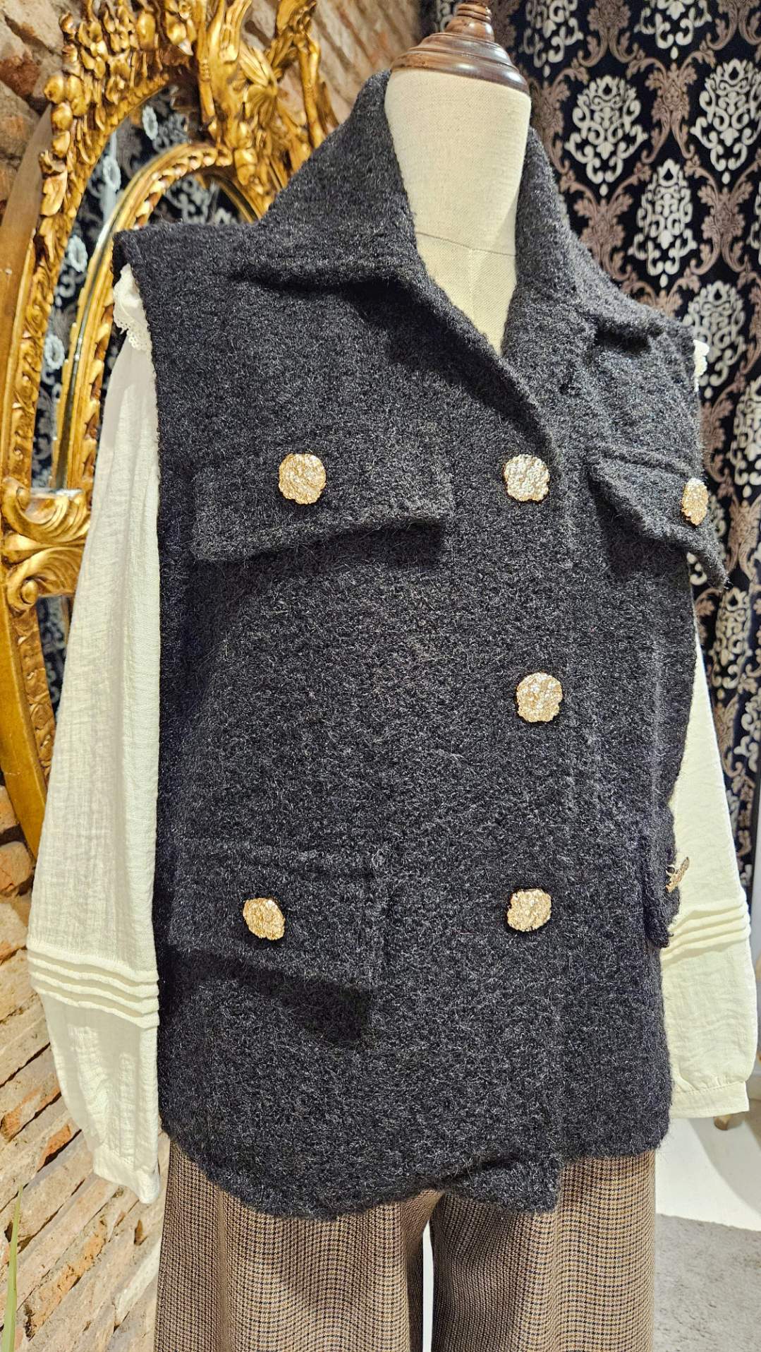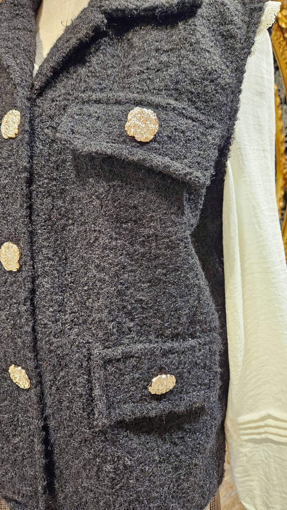 Chaleco con una textura que simula al tweed o lana áspera, con cuello solapa, bolsillos falsos con el detalle de los botones dorados. Cierre delantero con botones.