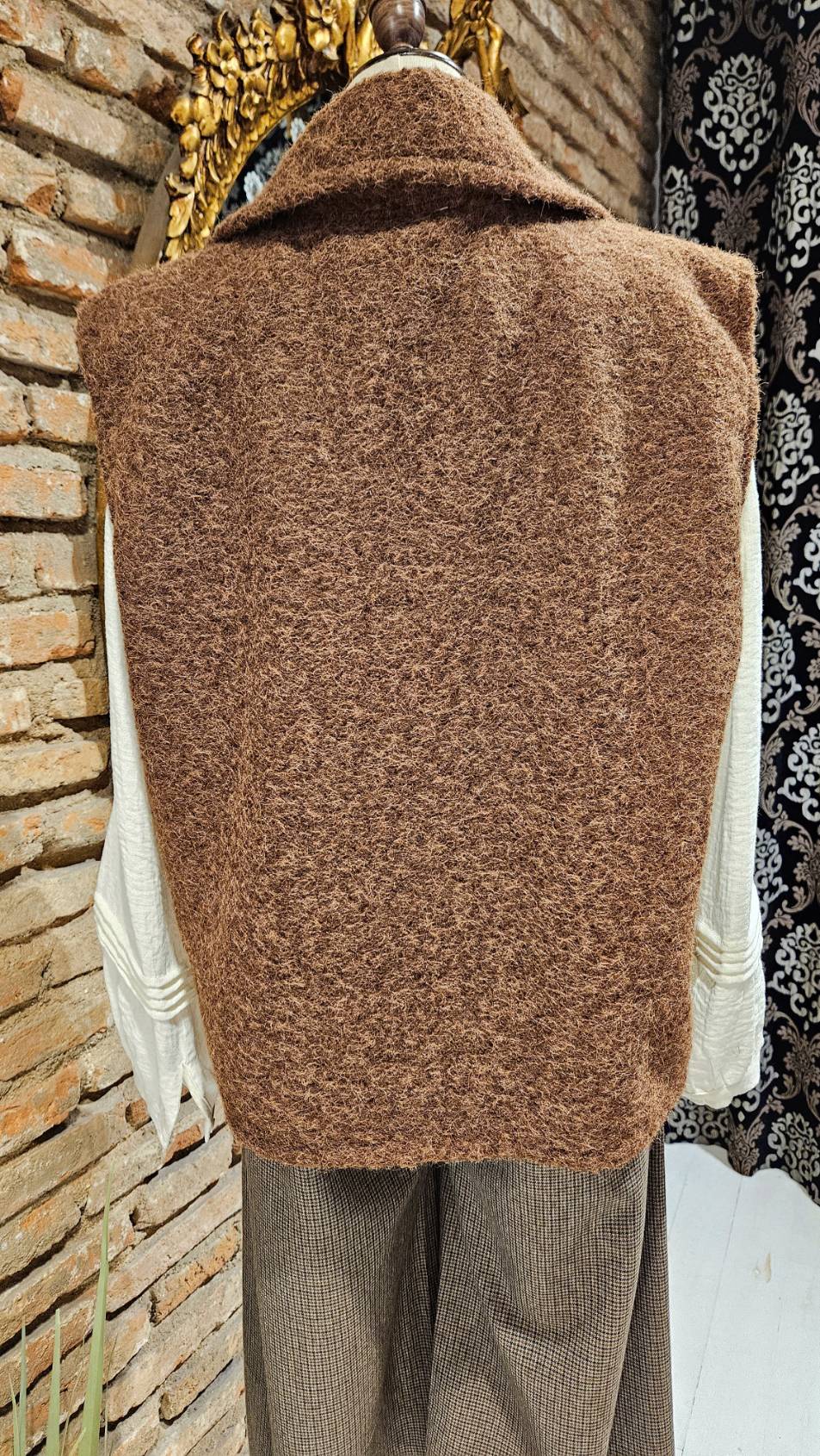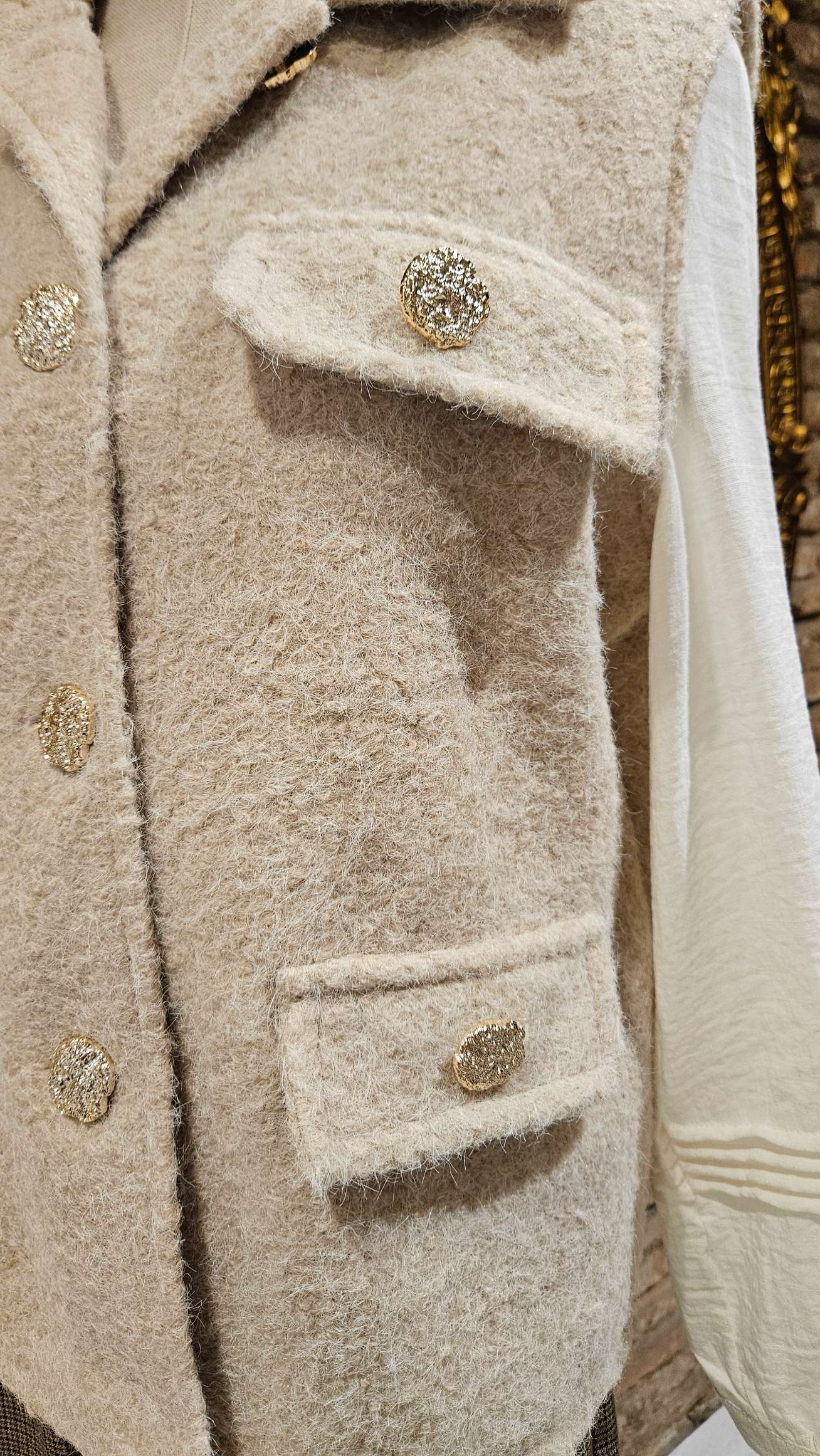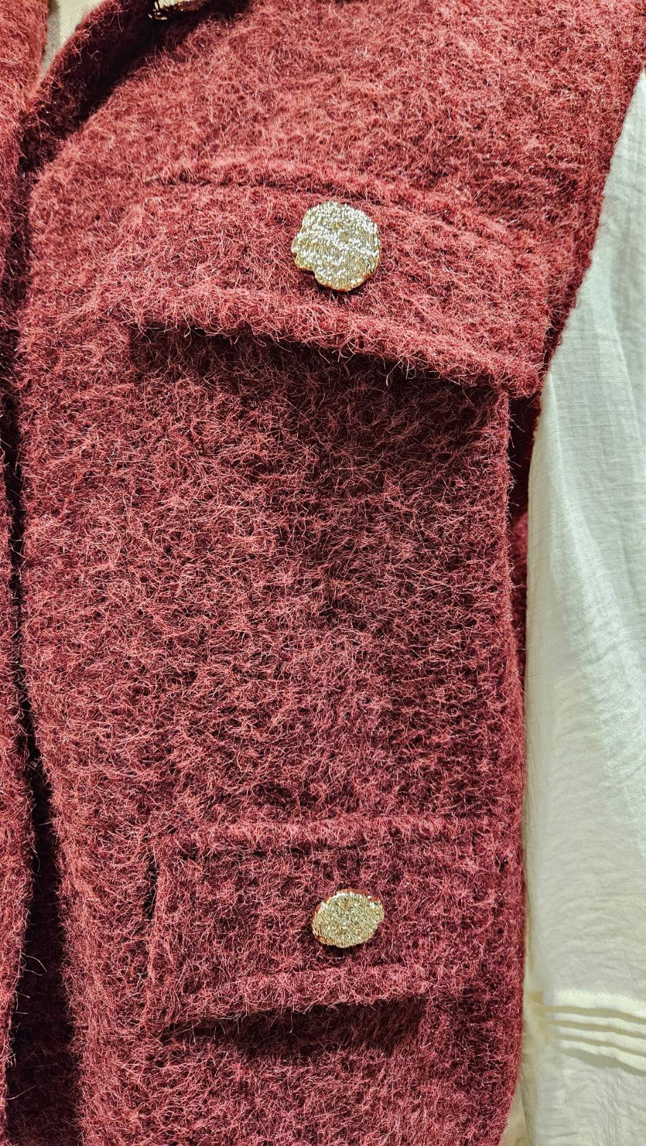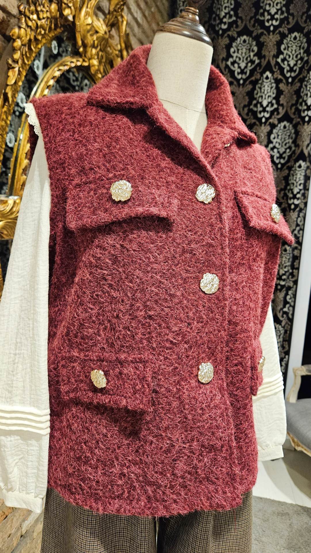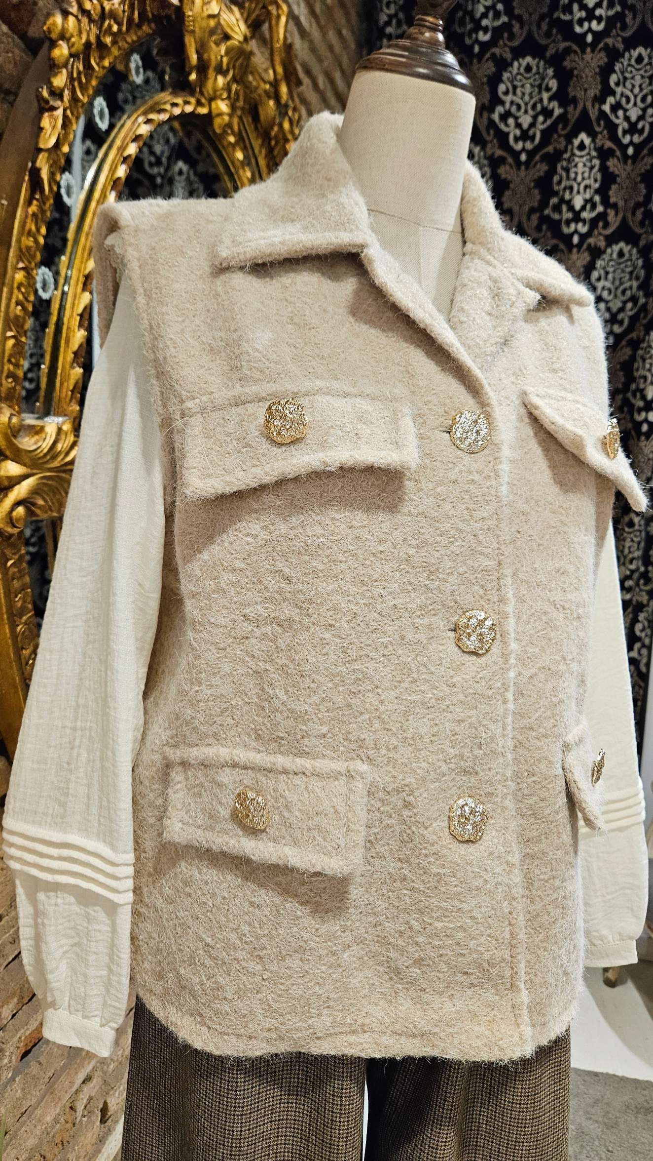 Chaleco con una textura que simula al tweed o lana áspera, con cuello solapa, bolsillos falsos con el detalle de los botones dorados. Cierre delantero con botones.