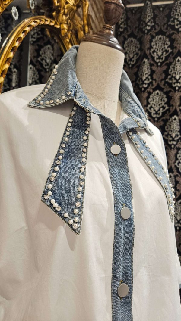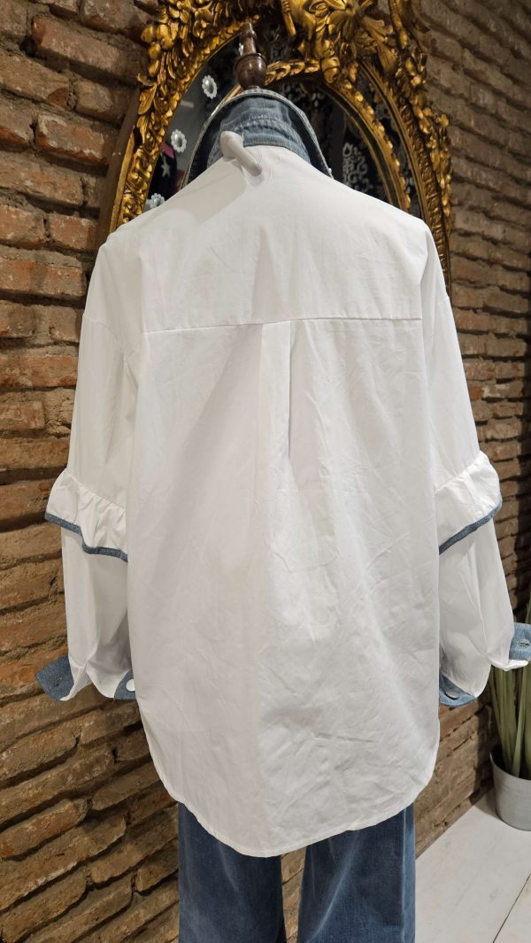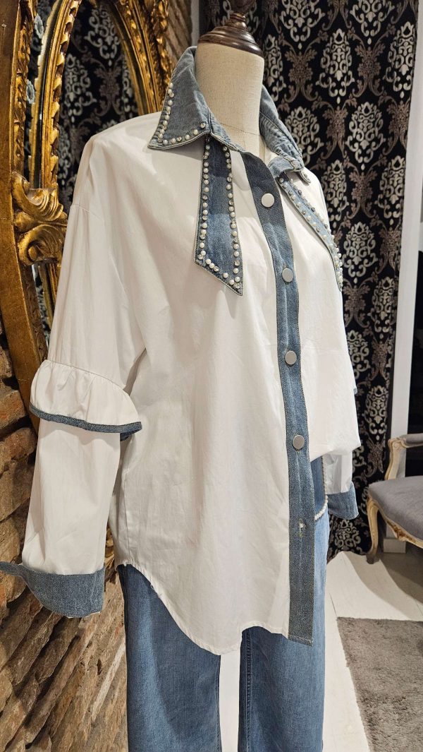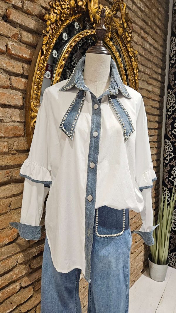 Camisa blanca combinada con denim en puños y cuello, estilo oversize con hombro caído, de manga larga con volante decorativo en mitad de la manga, bajo lateral en redondo. Detalle en el cuello y en las dos tiras que caen en el delantero con perlas y piedras.