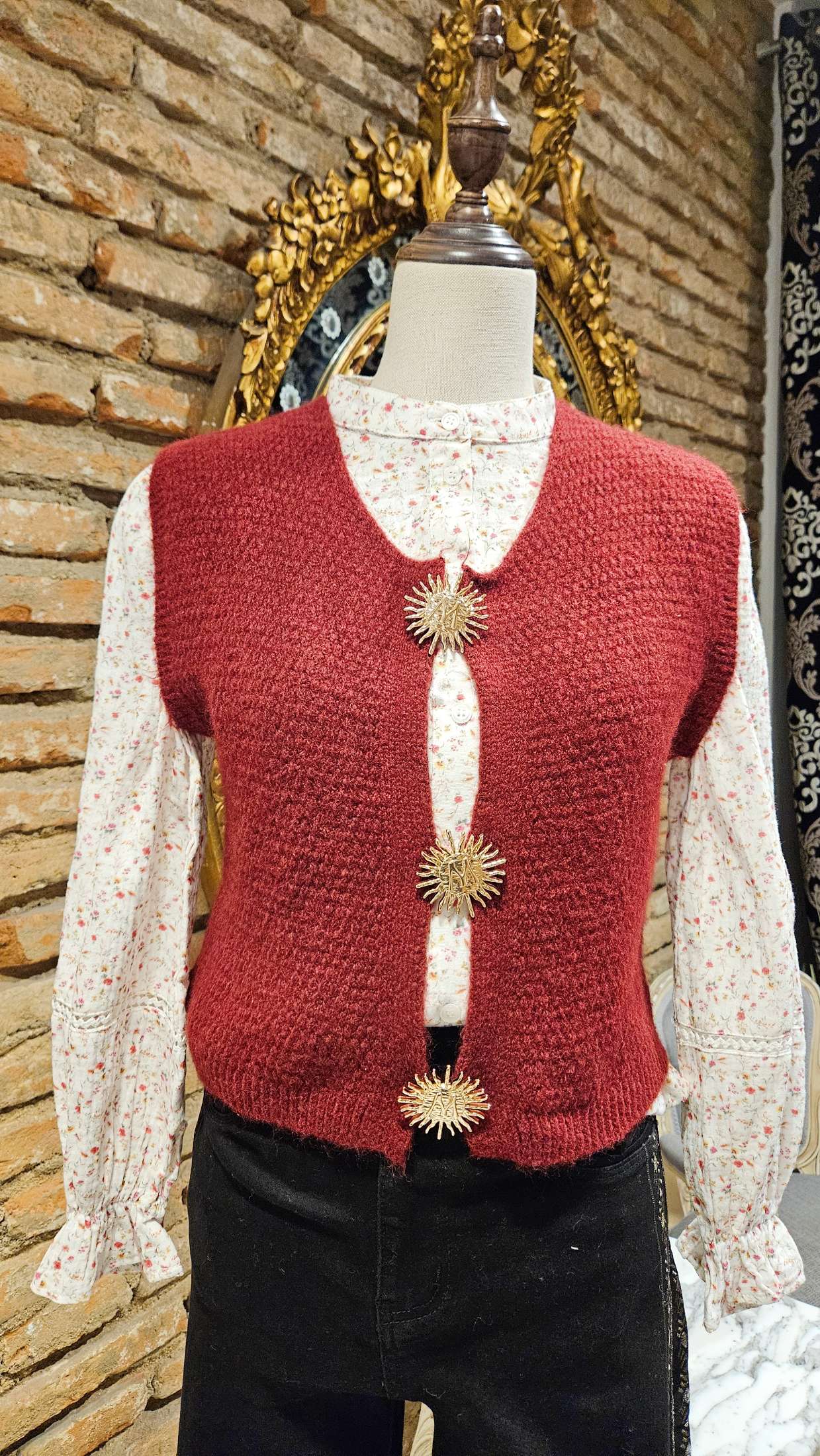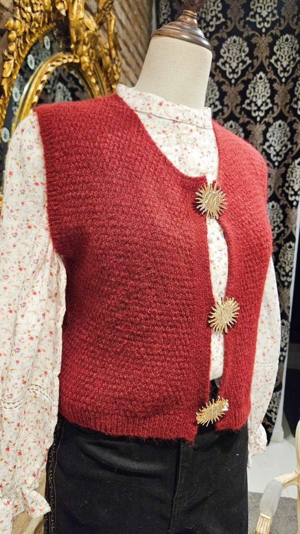 Chaleco de punto sin mangas de color burdeos. El chaleco está abrochado con tres broches decorativos de metal dorado en forma de sol/estrella.