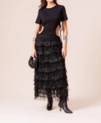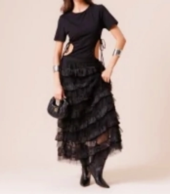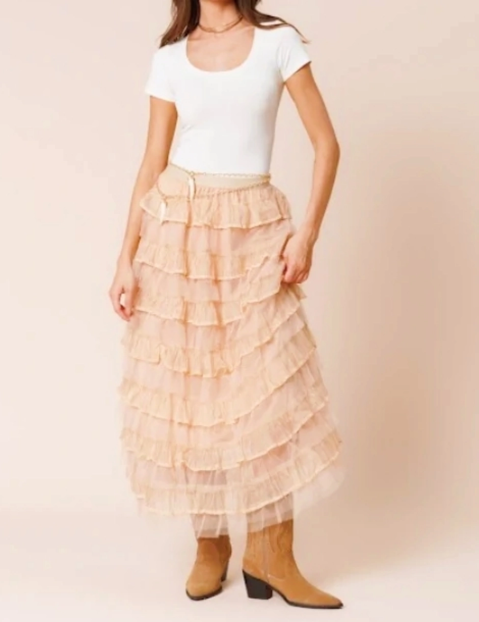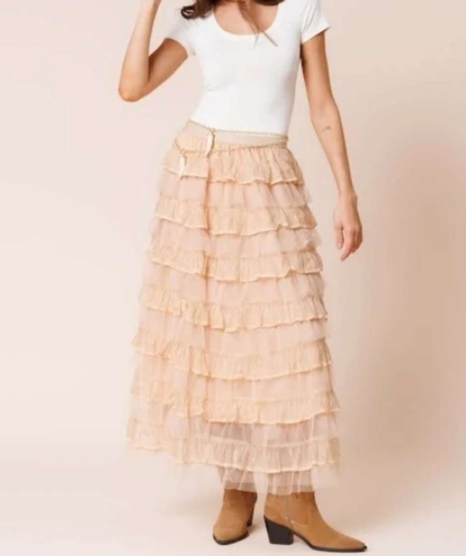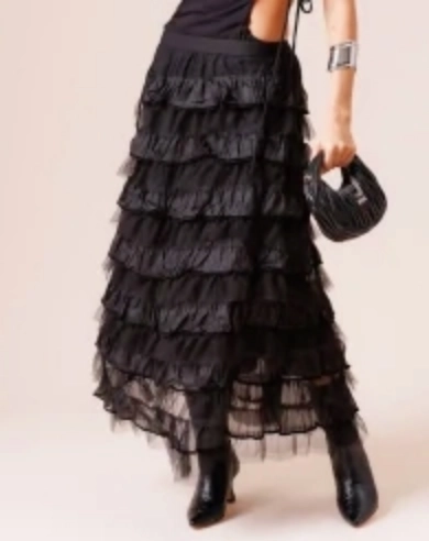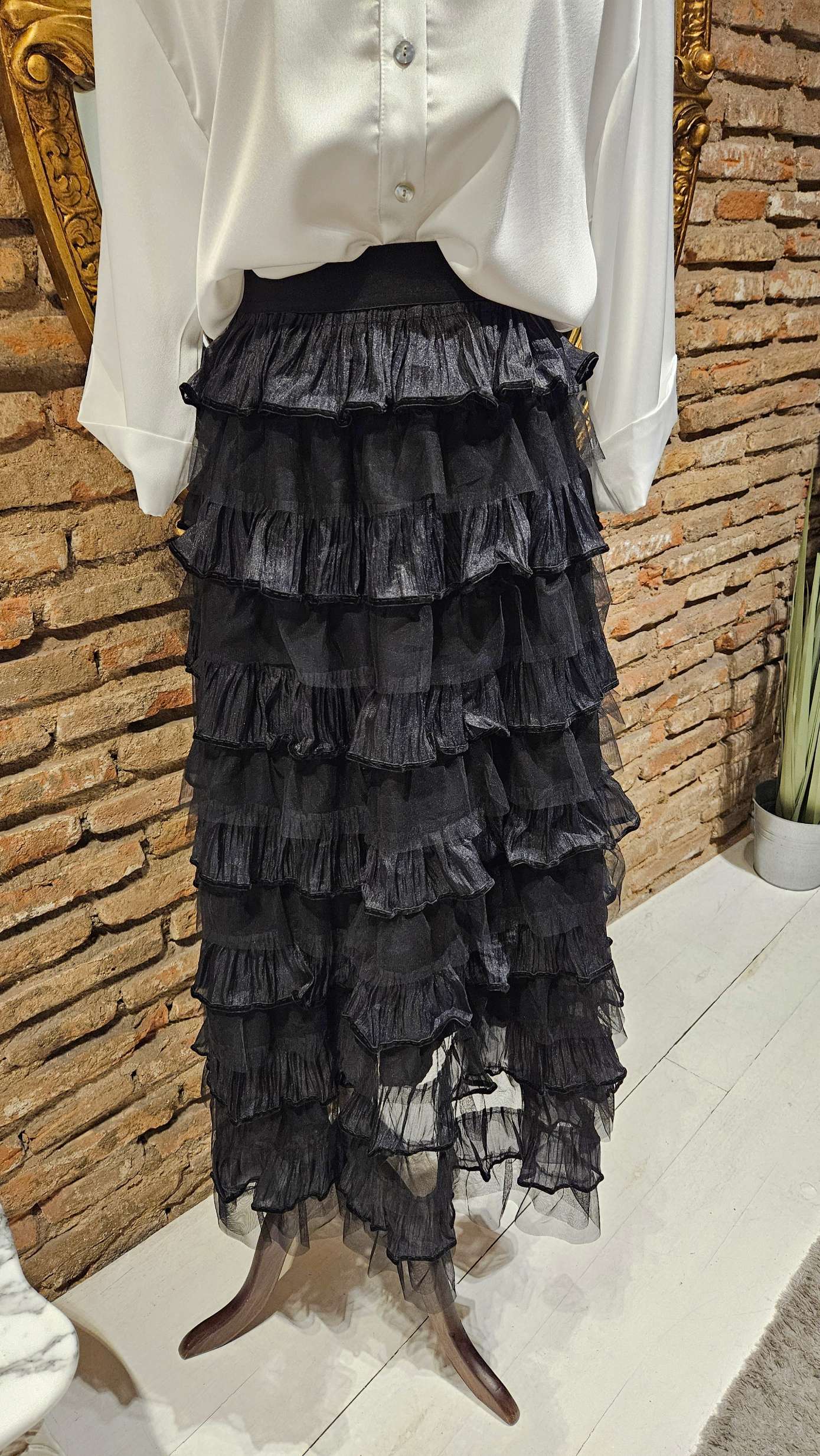 Falda larga con volantes en capa de tejido de tul. Cintura engomada. Forro interior.