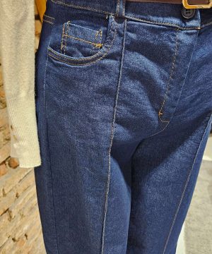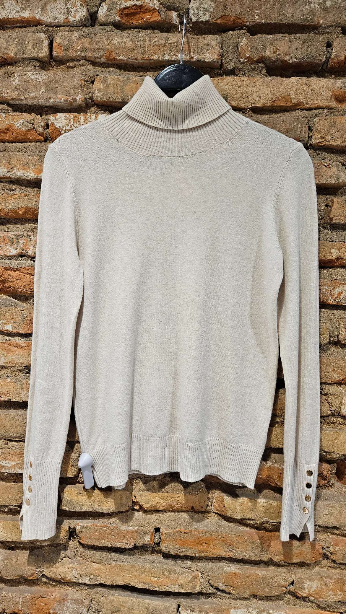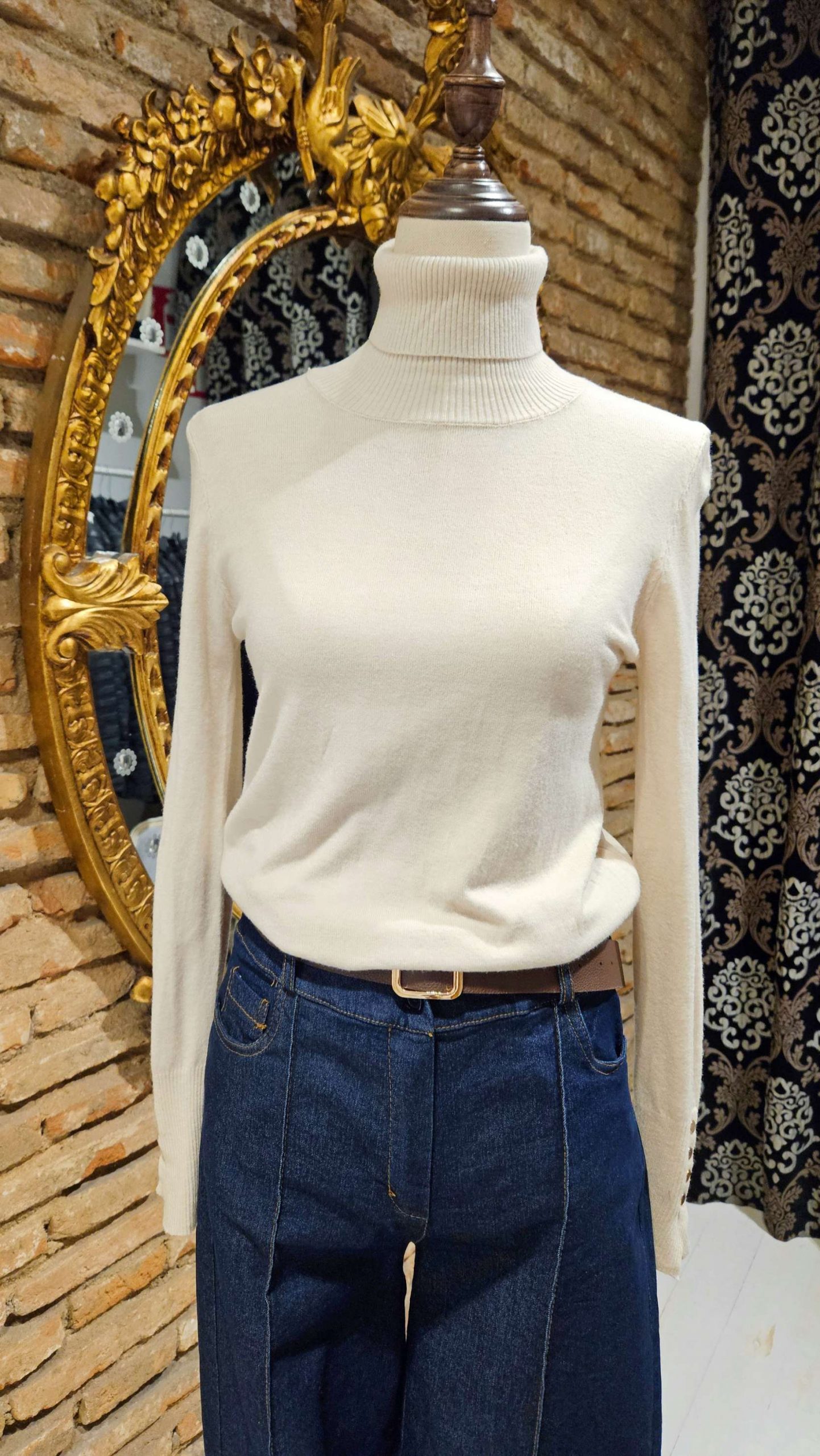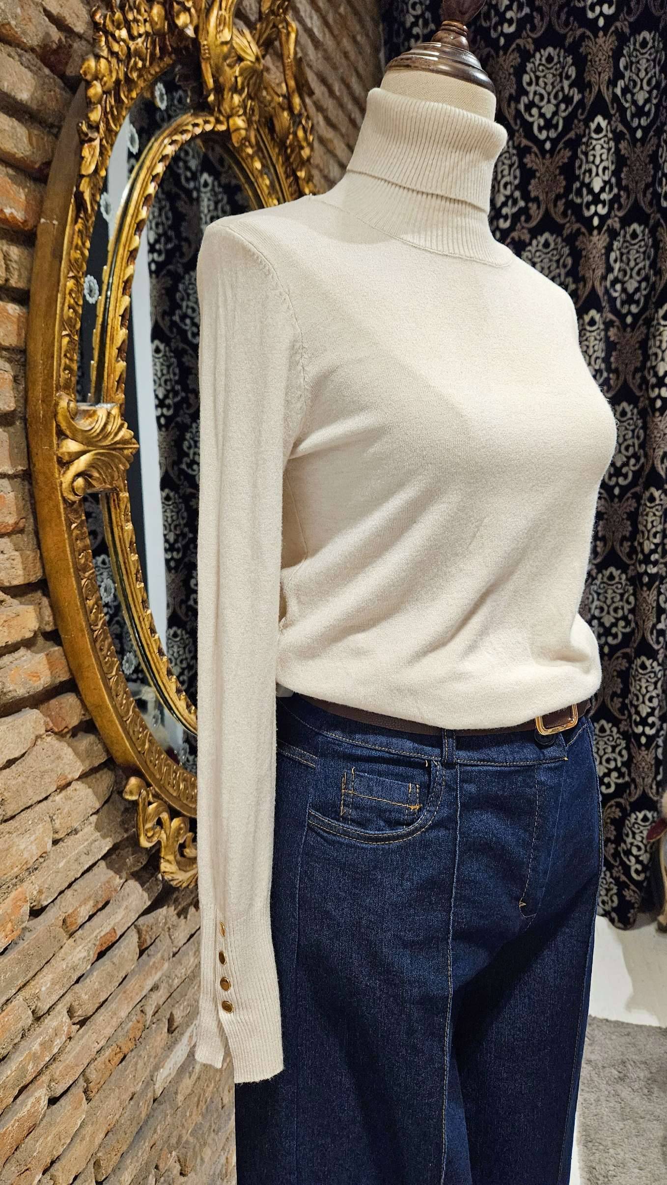 Jersey de punto con cuello alto y manga larga. Detalle de la abertura en el puño y los botones dorados que lleva.