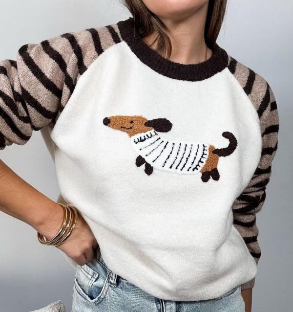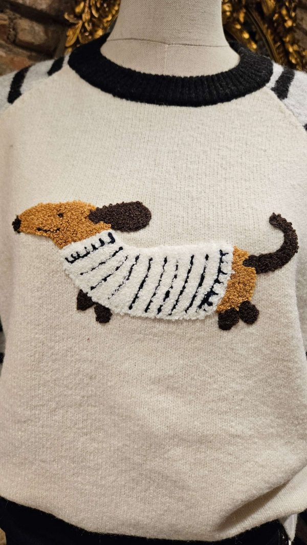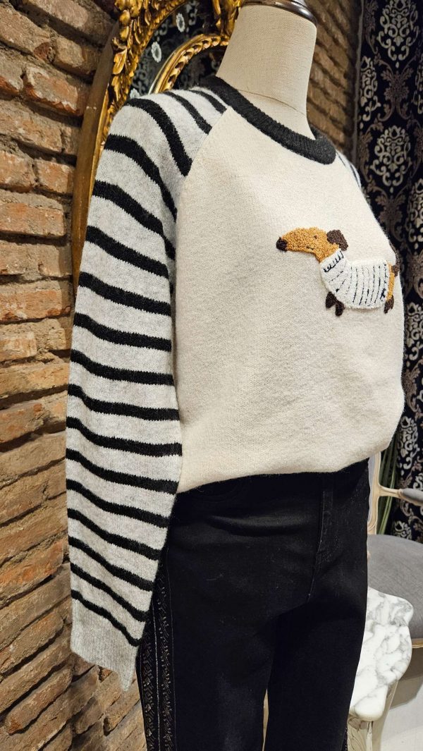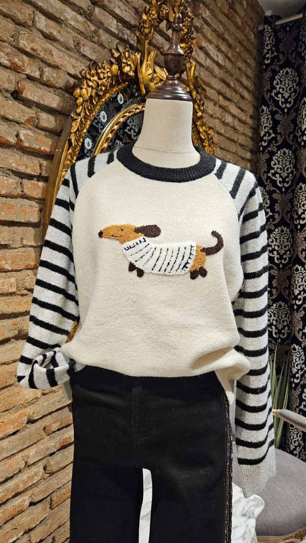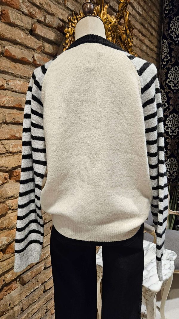 Jersey de punto con cuello caja en canalé. Detalle de las mangas  a rayas combinando colores grises y negros.