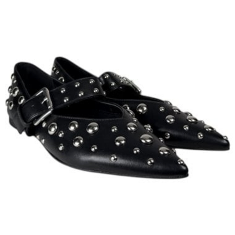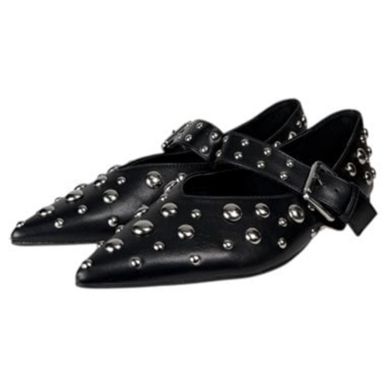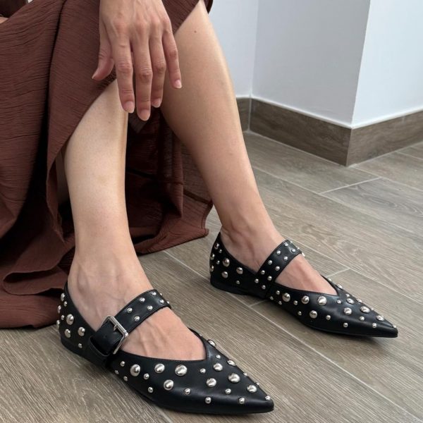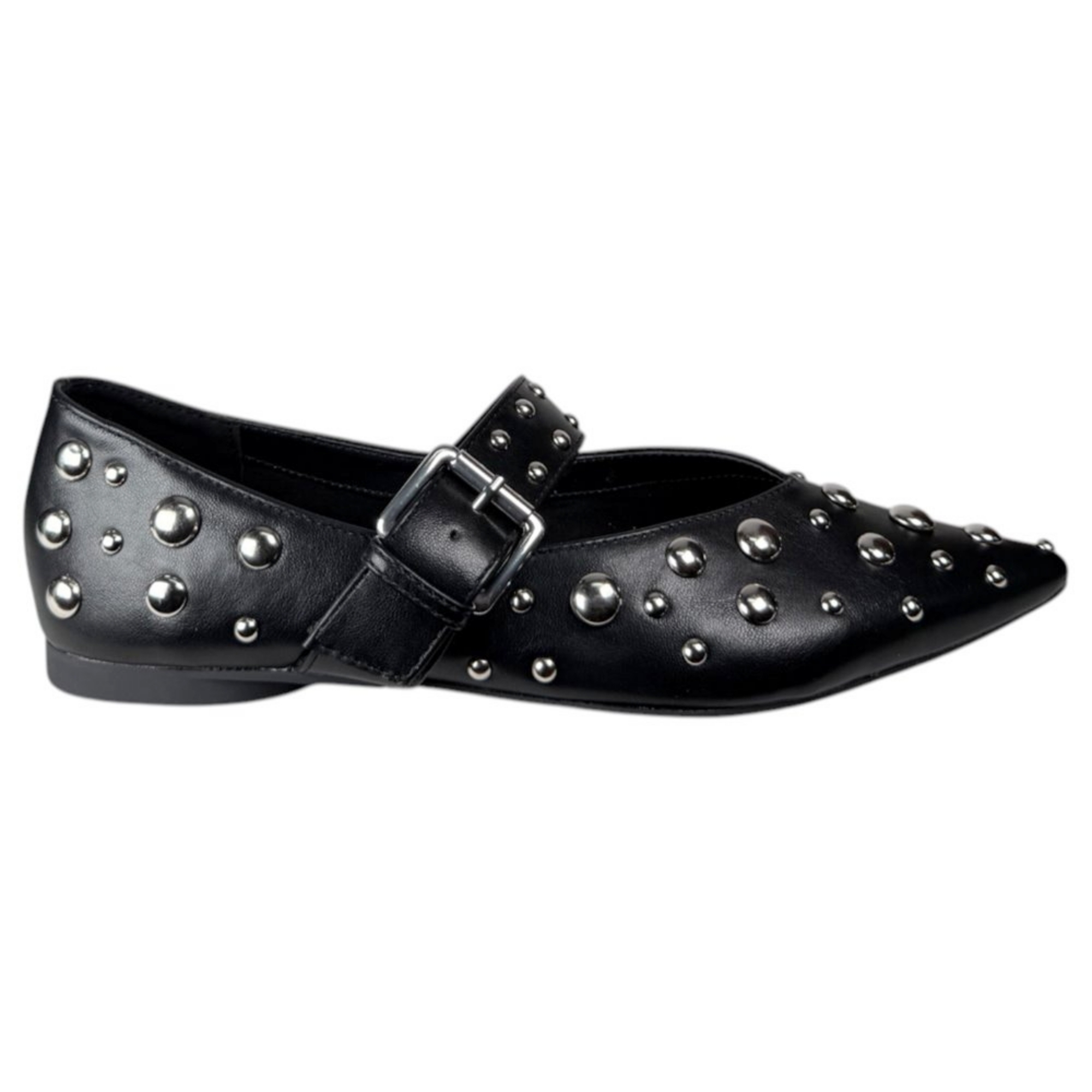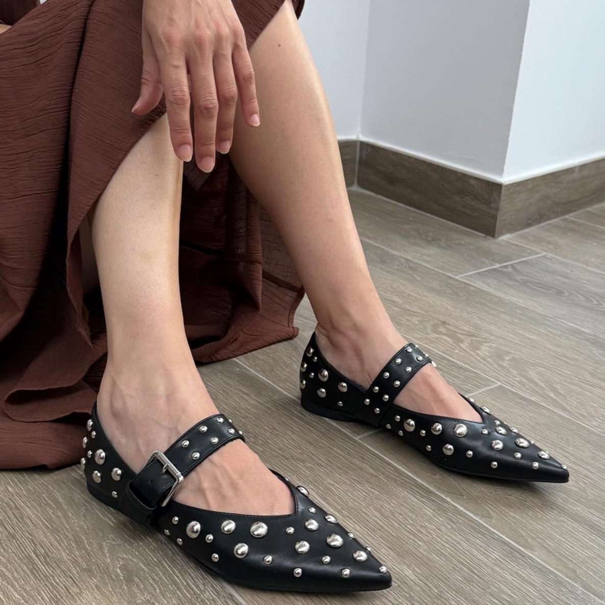 Diseño atrevido con hebilla lateral y tachas por todo el calzado. Corte en piel sintética muy blandita. Acabado en puntera afilada. Plantilla que otorga un buen confort al caminar. Este modelo de bailarina no pasarán desapercibidas y serán un imprescindible en tu fondo de armario.