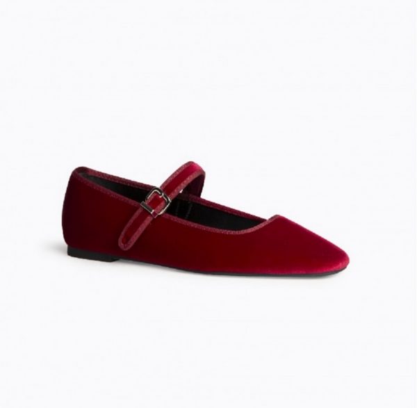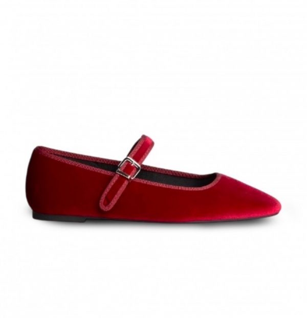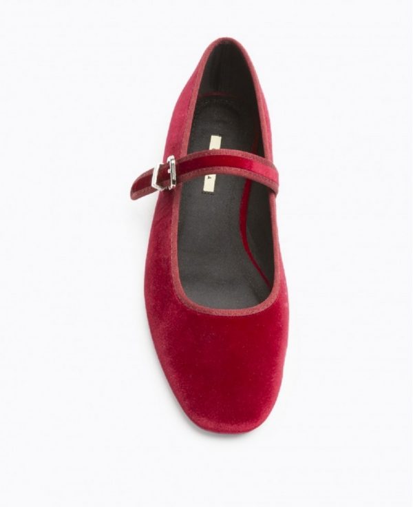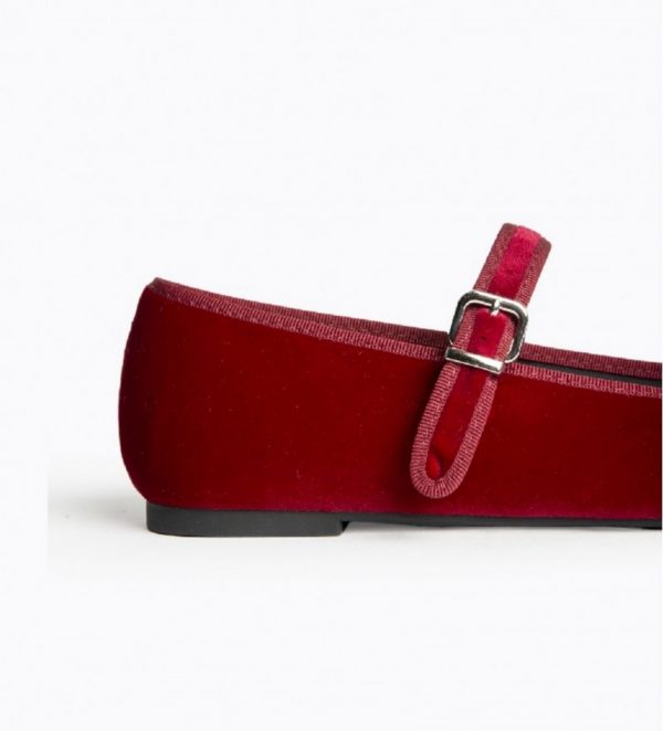 Merceditas confeccionadas en un suave y lujoso terciopelo de color burdeos. Diseño de su puntera redonda y tira con hebilla que evoca un encanto atemporal. Las costuras en contraste resaltan la forma del zapato. Diseño plano que te permite caminar con total confort. Perfectas para un look de noche, una fiesta o simplemente para darle un toque chic a tu día.