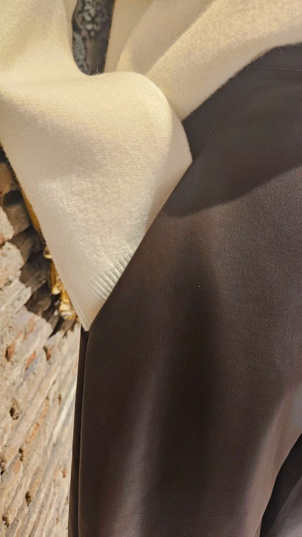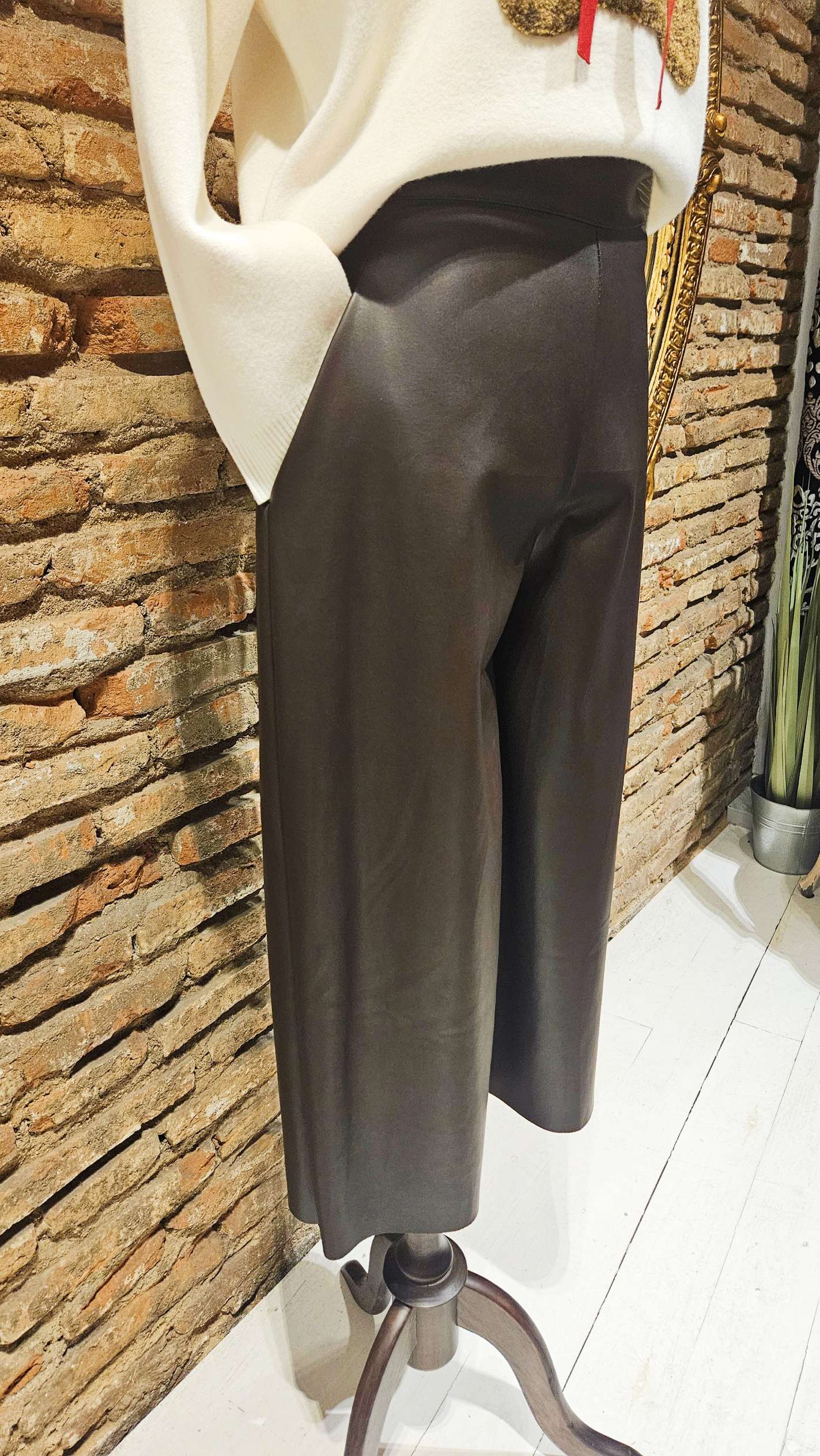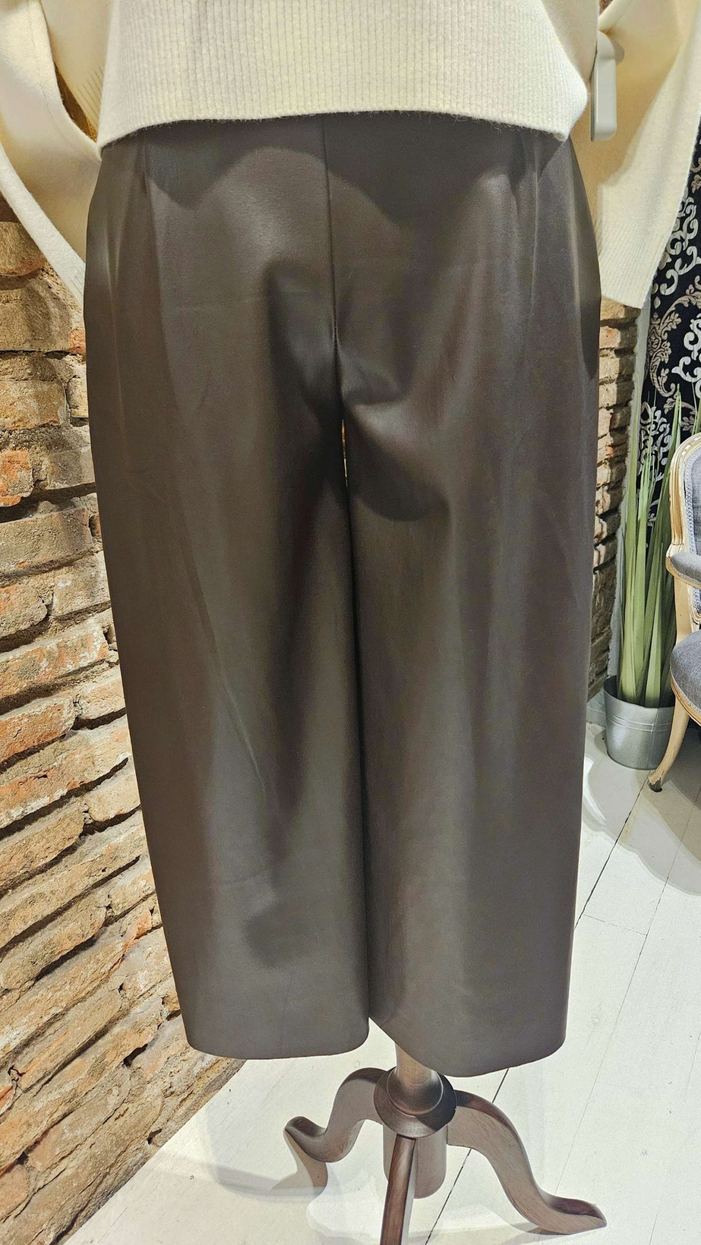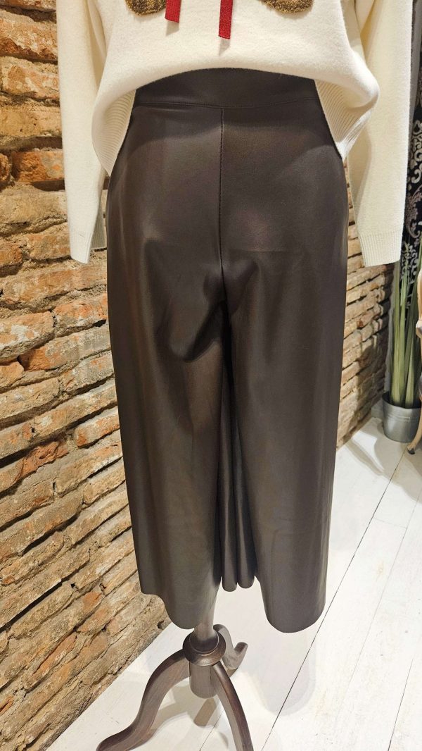 Pantalón palazzo de polipiel marrón. Cierre con cremallera oculta en el lateral. Bolsillos en la zona delantera y pinza trasera.