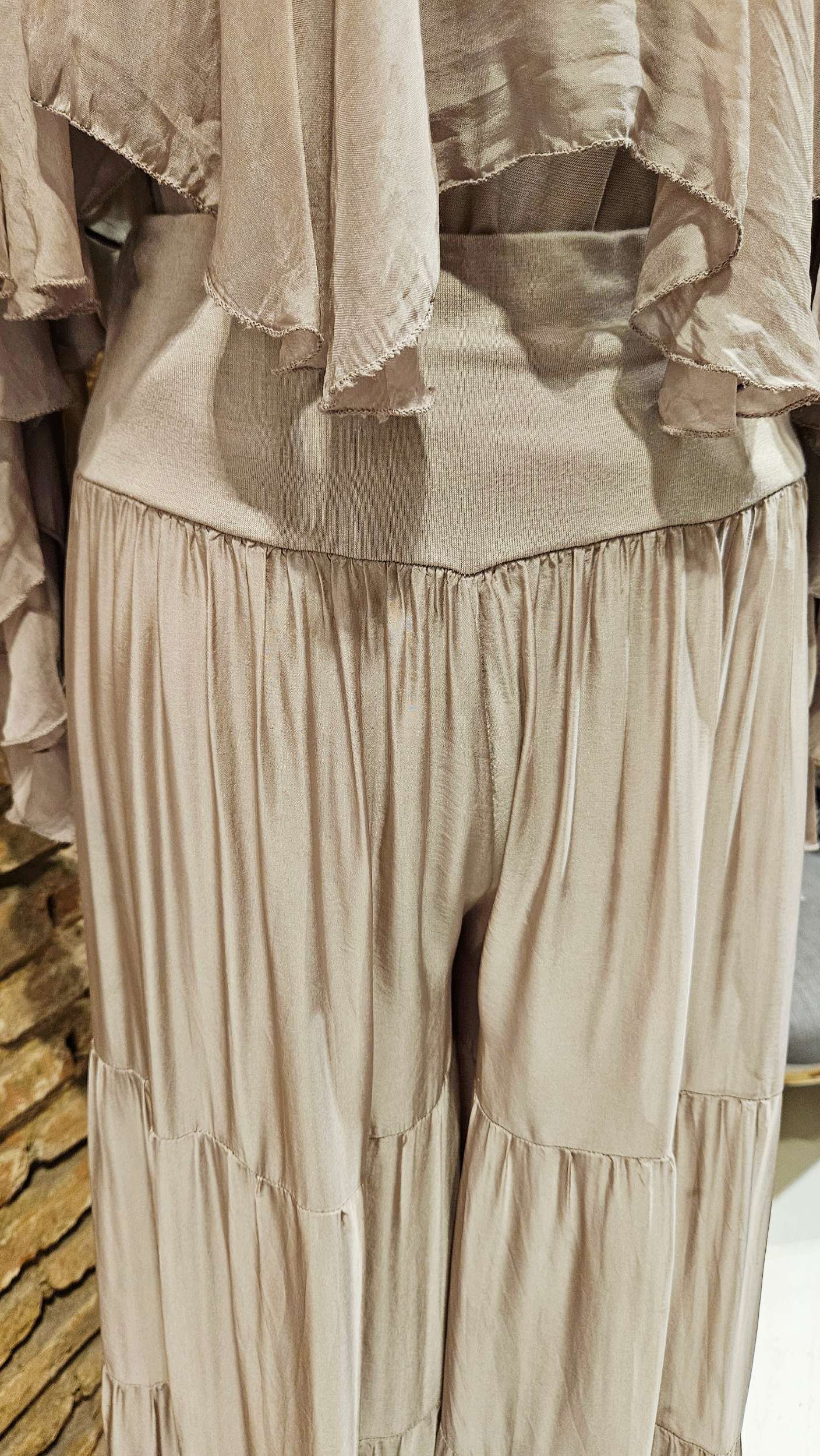 Pantalón de seda con costuras. Pierna con mucho vuelo, forro interior y cinturilla de punto ancha.