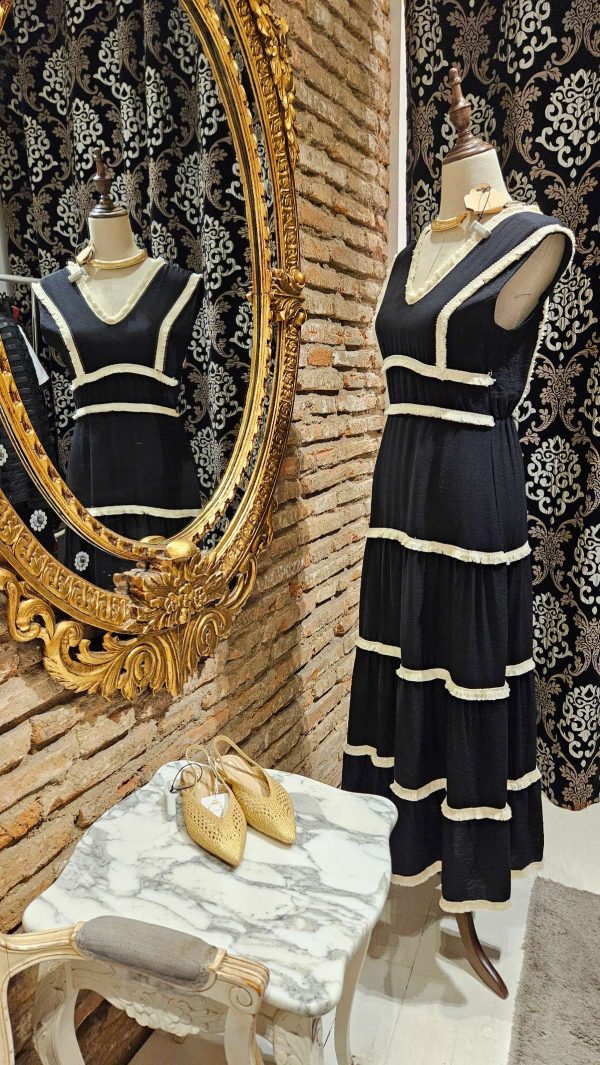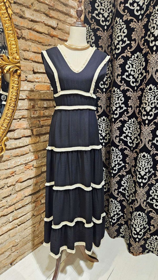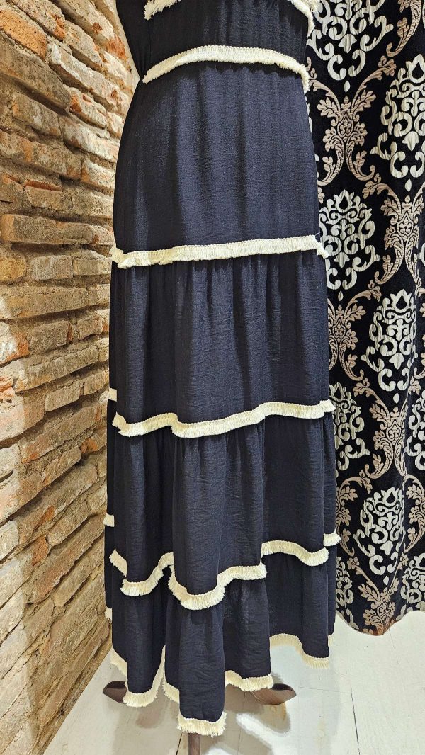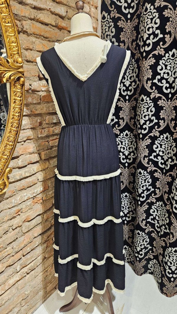 Vestido largo midi con escote en delantero y espalda en forma de V. Detalles decorativos desflecados en contraste de color beige. Falda con tres volantes. Cintura engomada.