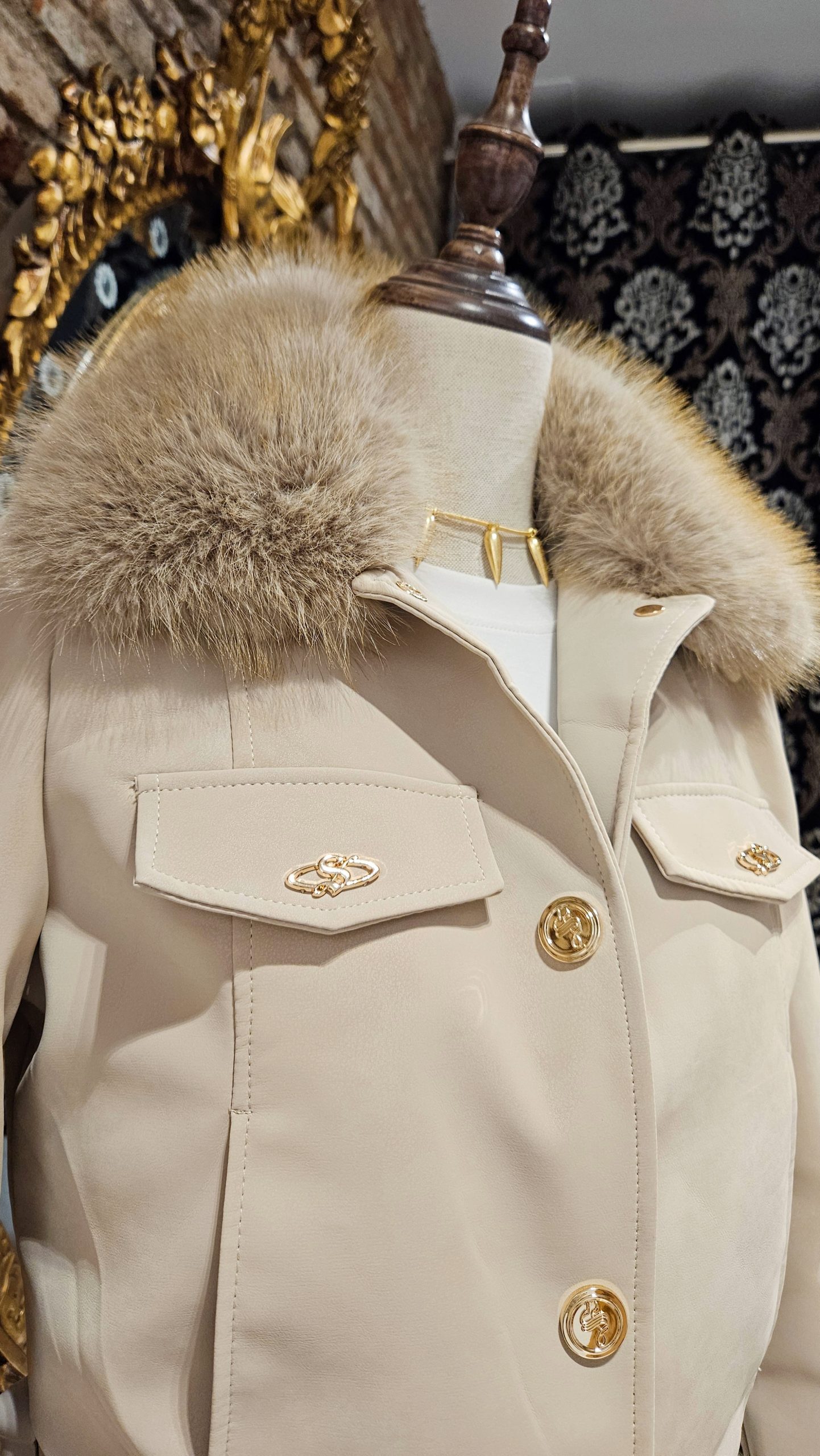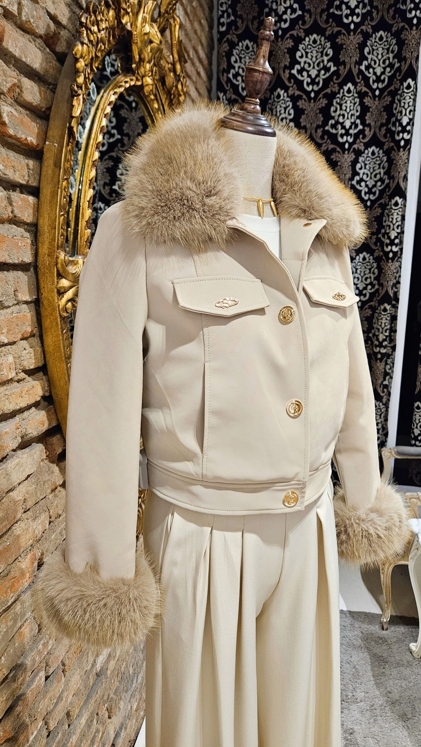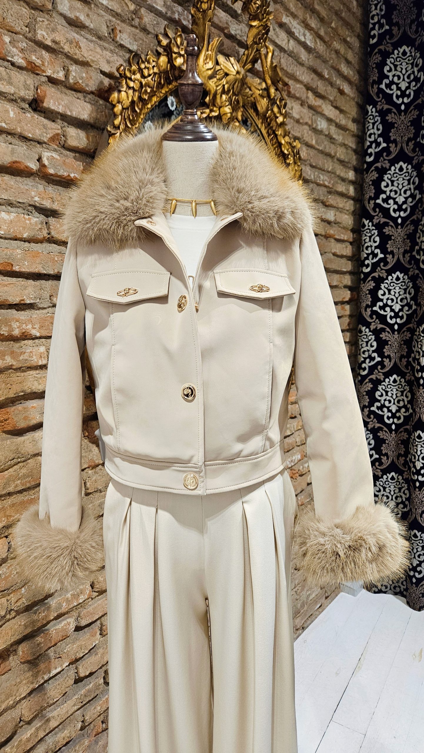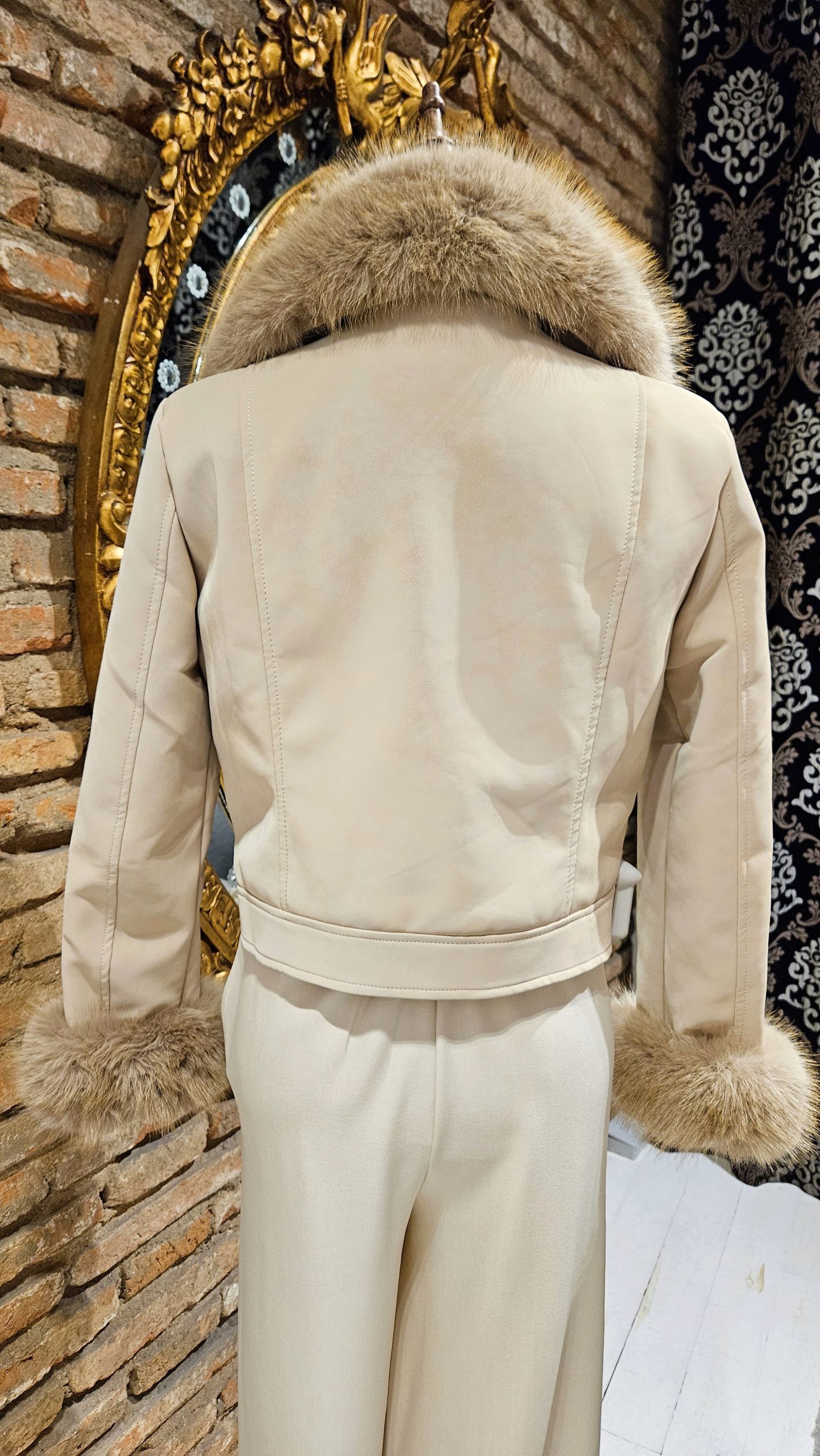 Chaqueta en color beige, su diseño suave y envolvente piel sintética, con el cuello y los puños en pelo desmontable, que le aporta un toque lujoso y femenino. El corte corto y estructurado realza la silueta, mientras que los botones dorados y bolsillos delanteros realzan el look. Forrada interiormente.