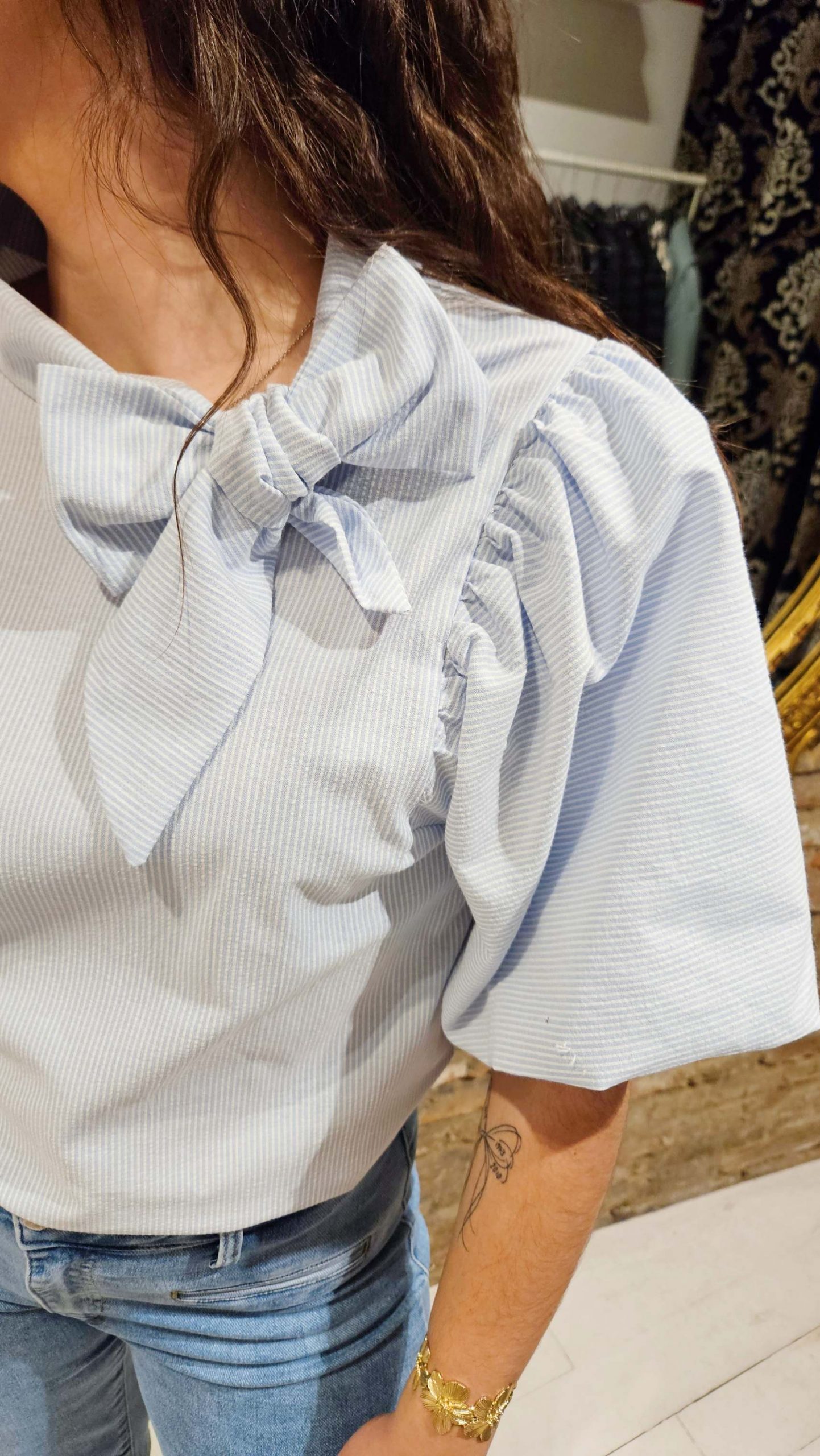Blusa de rayas finas en azules y blancas. Cuello grande y estructurado con un lazo prominente en la parte delantera, que se anuda para crear el detalle del lazo. Mangas cortas abullonadas con puño elástico. Corte recto. Estilo clásico y versátil adecuado para un look profesional o casual elegante.