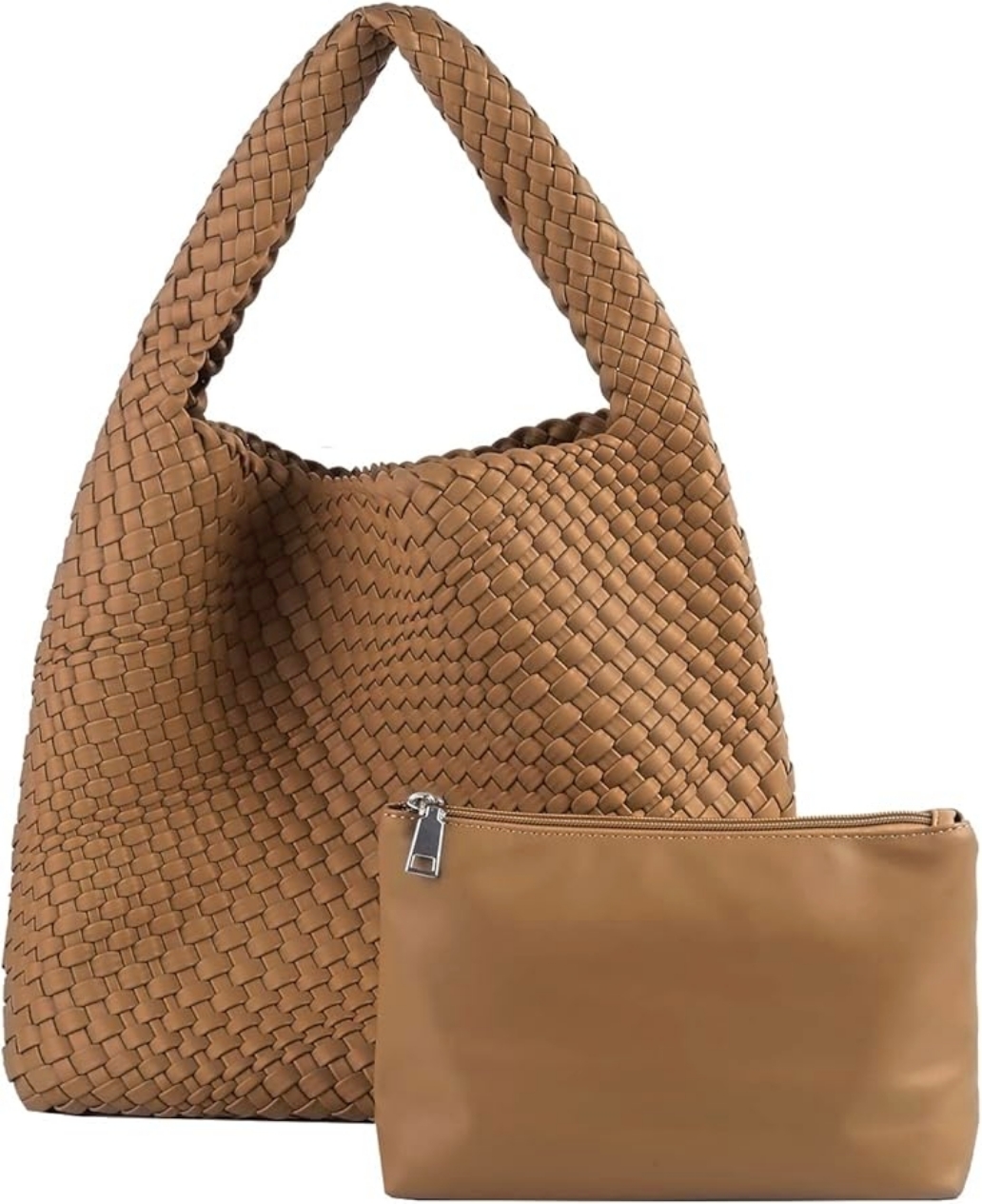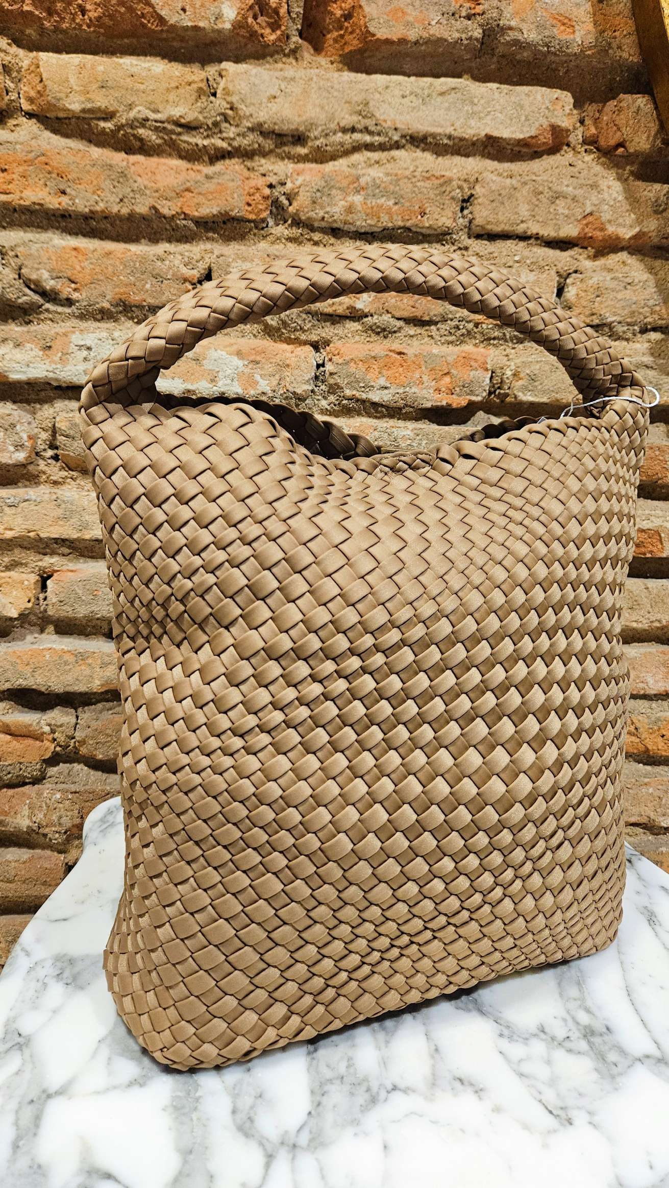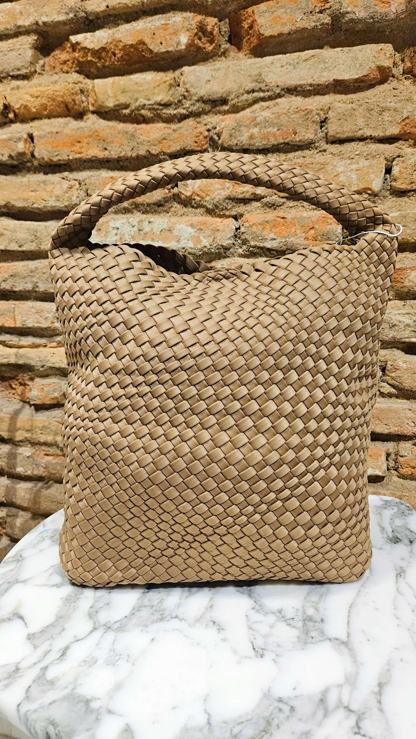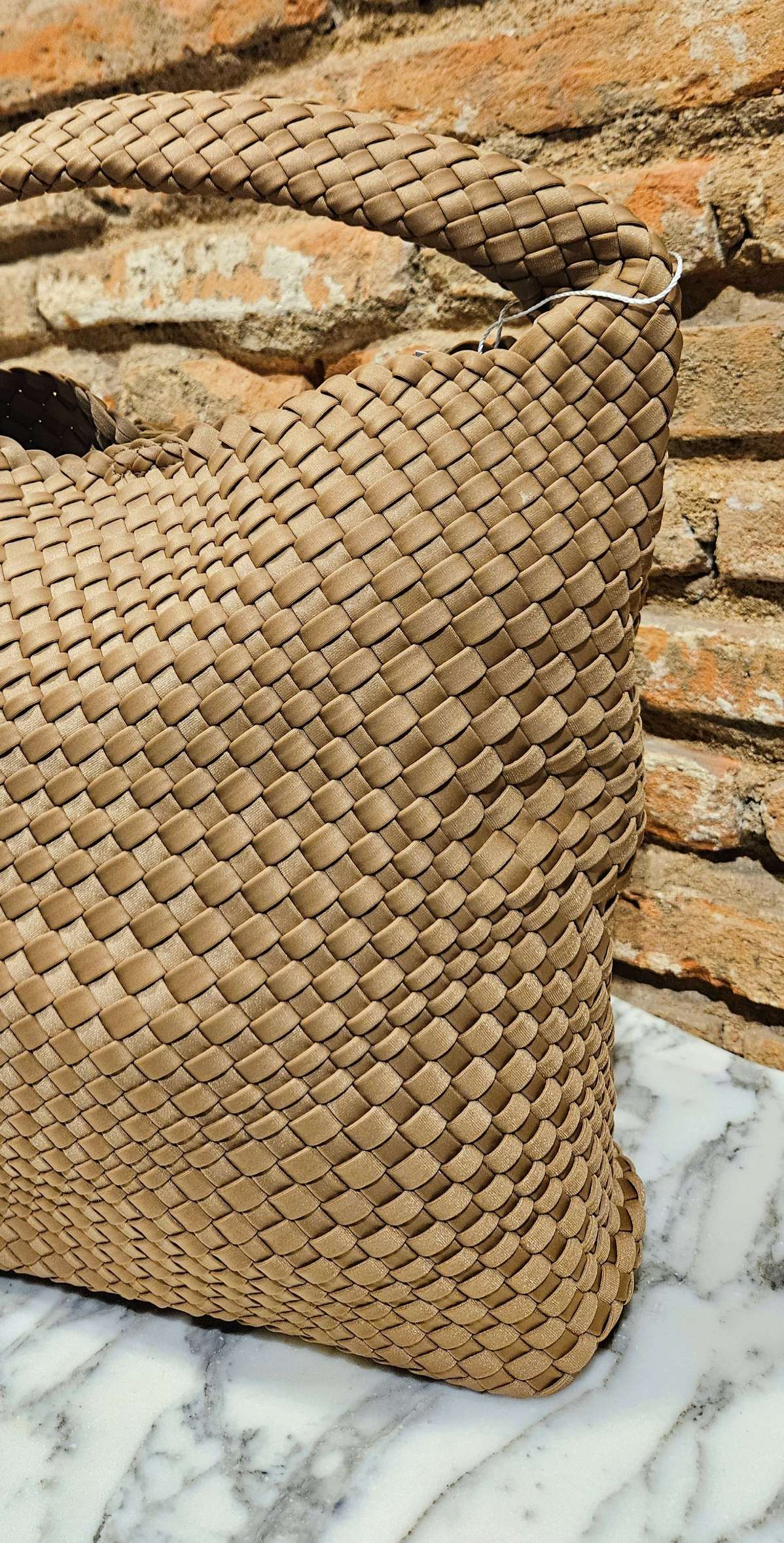 Bolso de asa trenzado en tela. Dispone de monedero grande. Cierre con clip imantado.