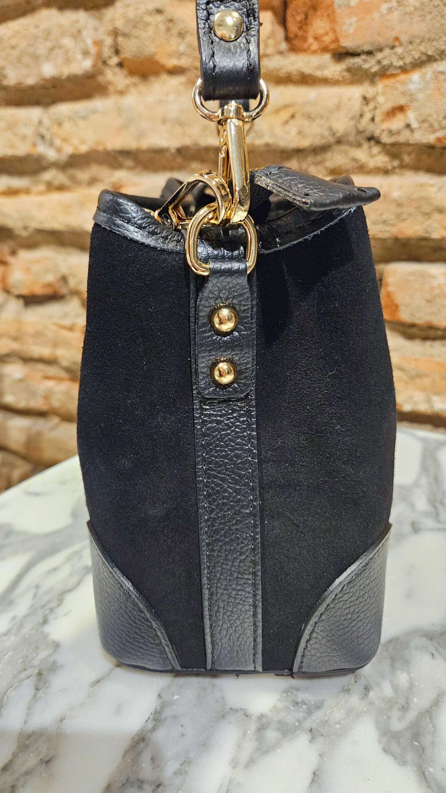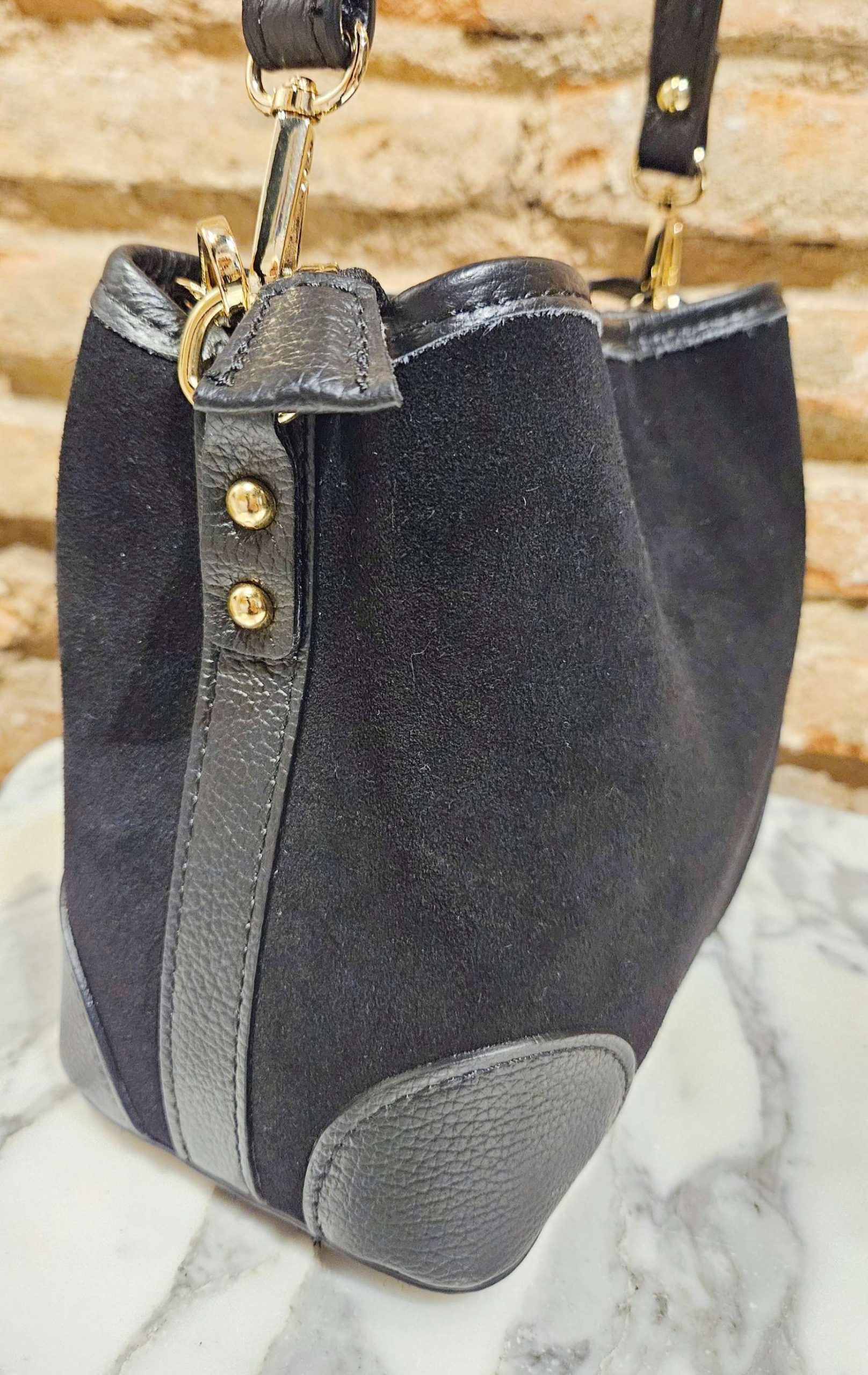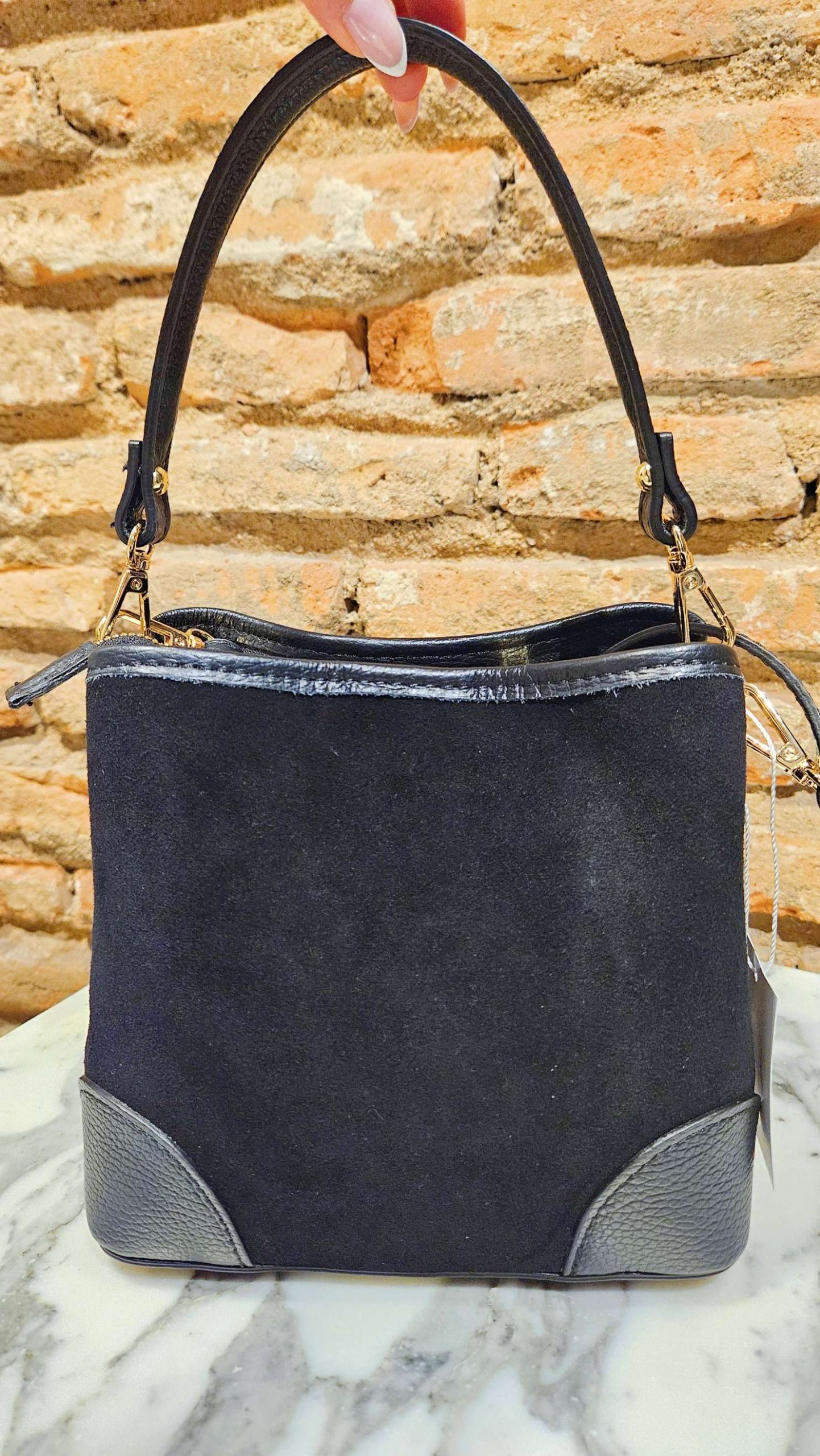 Bolso de ante y piel. Es un bolso elegante y compacto elaborado con ante de lujo. Ofrece un amplio espacio para lo esencial, manteniendo una silueta sofisticada. Con un cierre de cremallera seguro, patas protectoras y una correa de hombro desmontable.