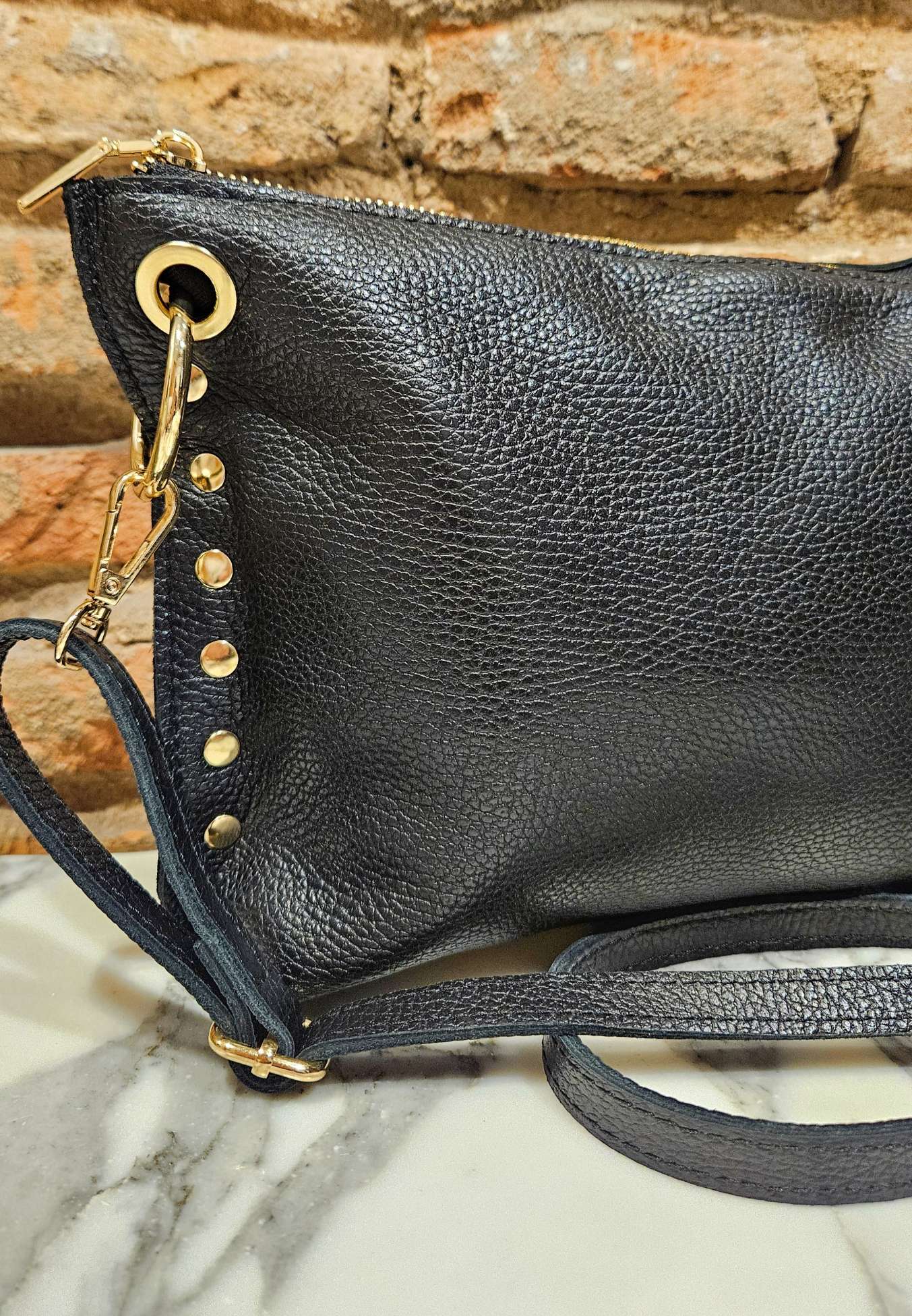 Bolso bandolera de piel con tachuelas laterales. Asa regulable. Forro interior, bolsillo con cremallera.
