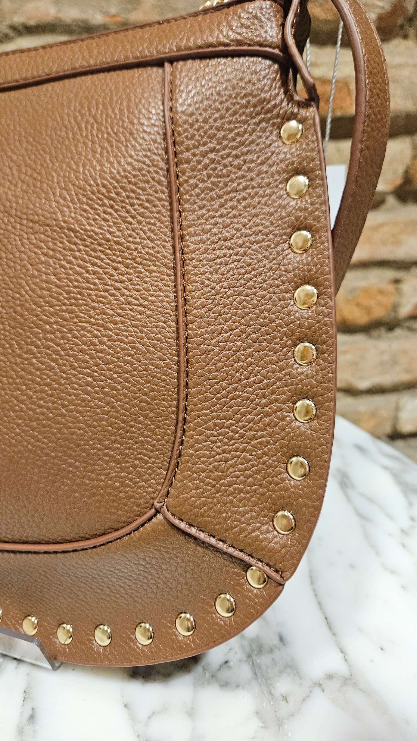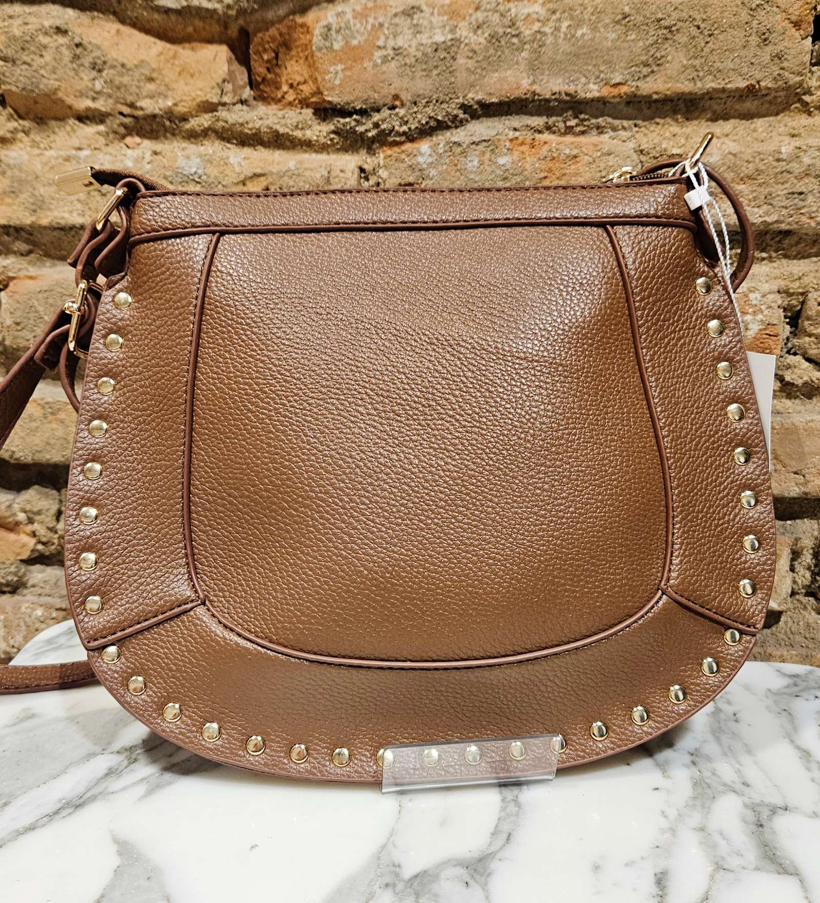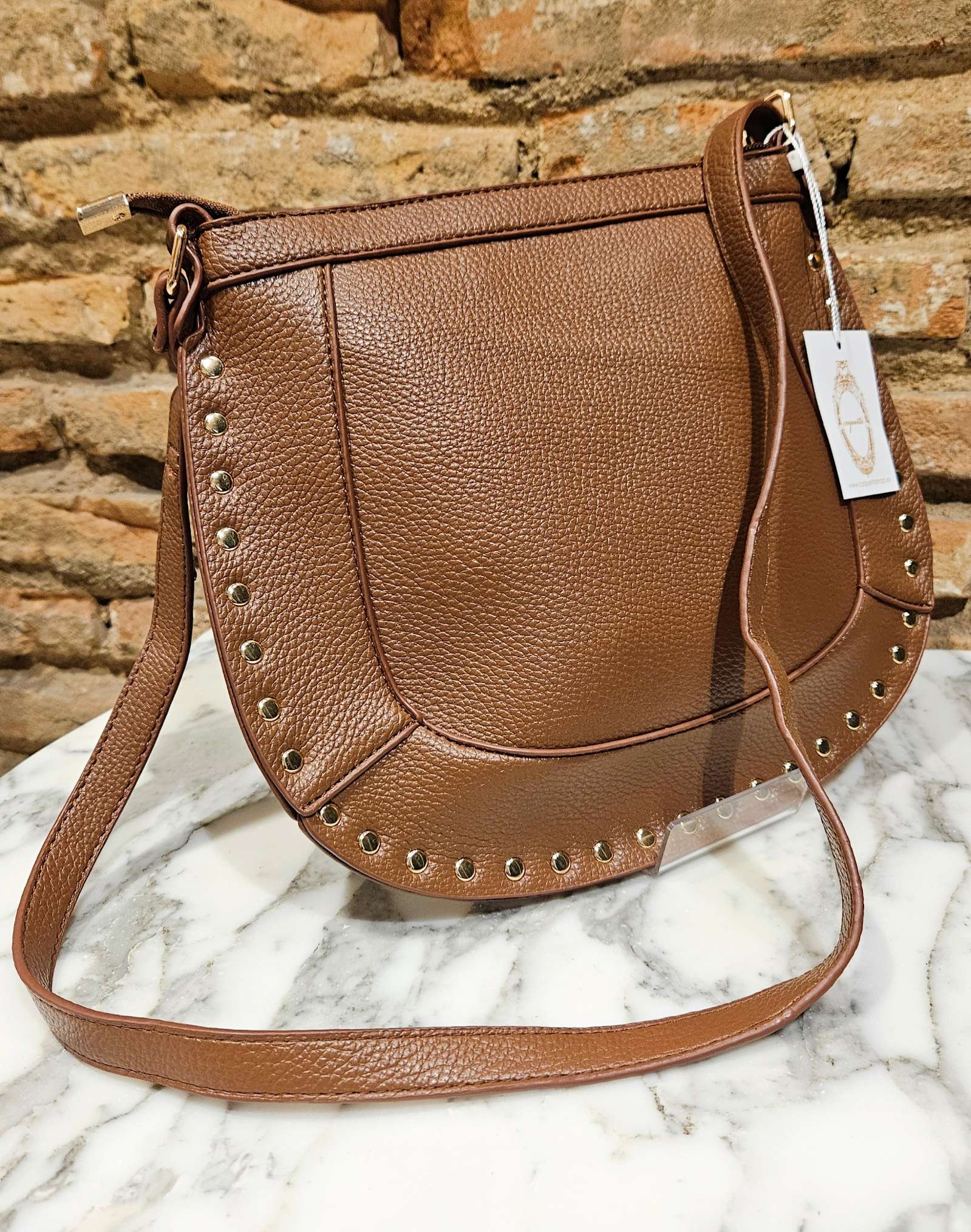 Bolso estilo castañuela de ppiel granulada y rodeado de tachuelas. Asa larga regulable y cierre con cremallera.