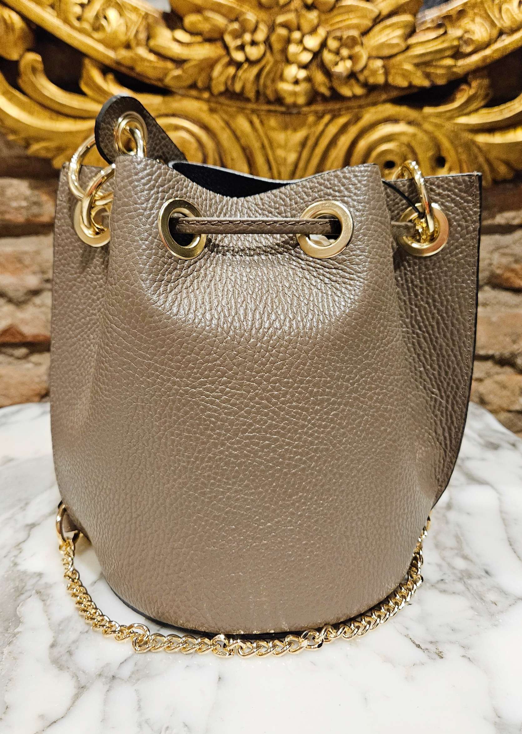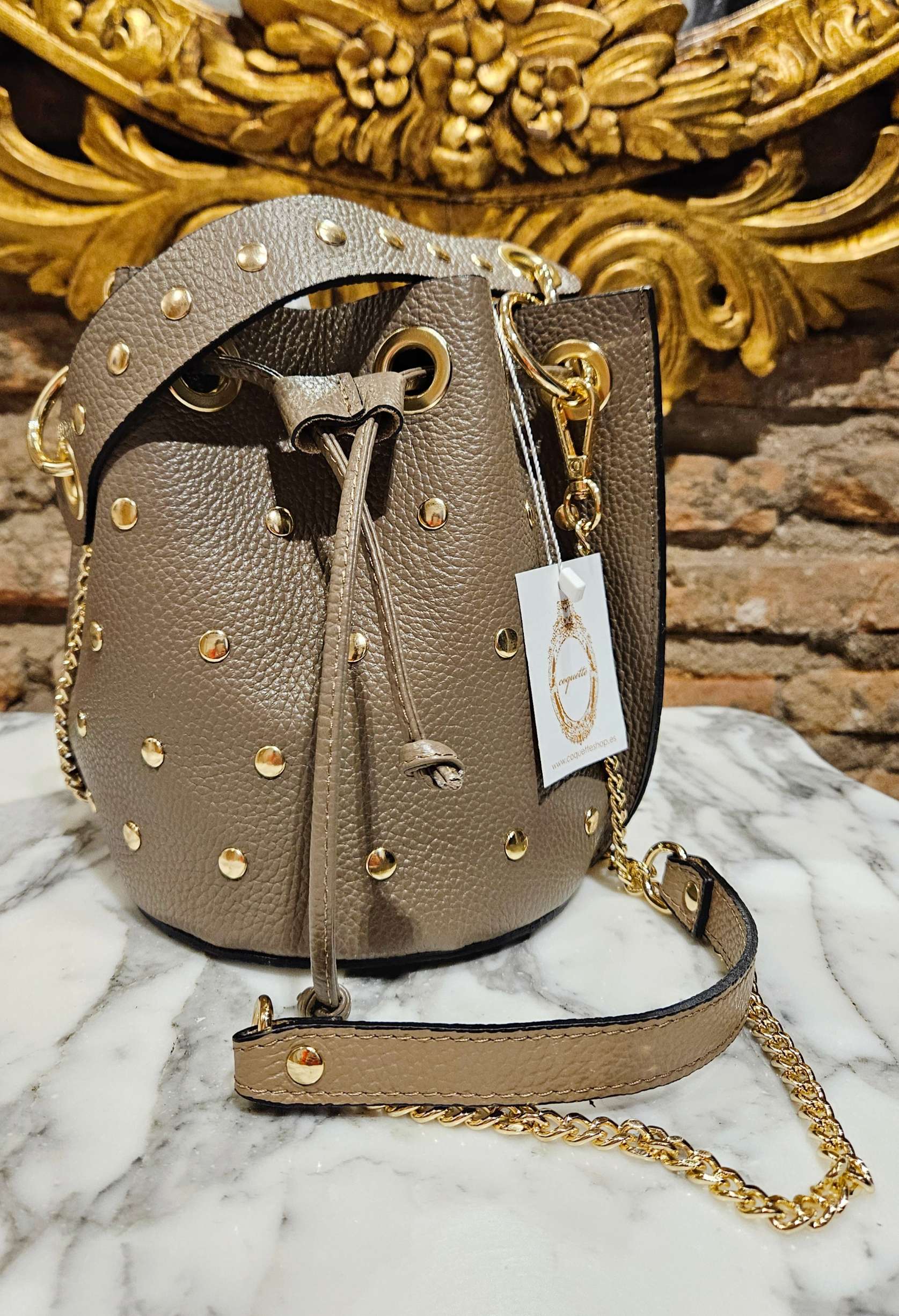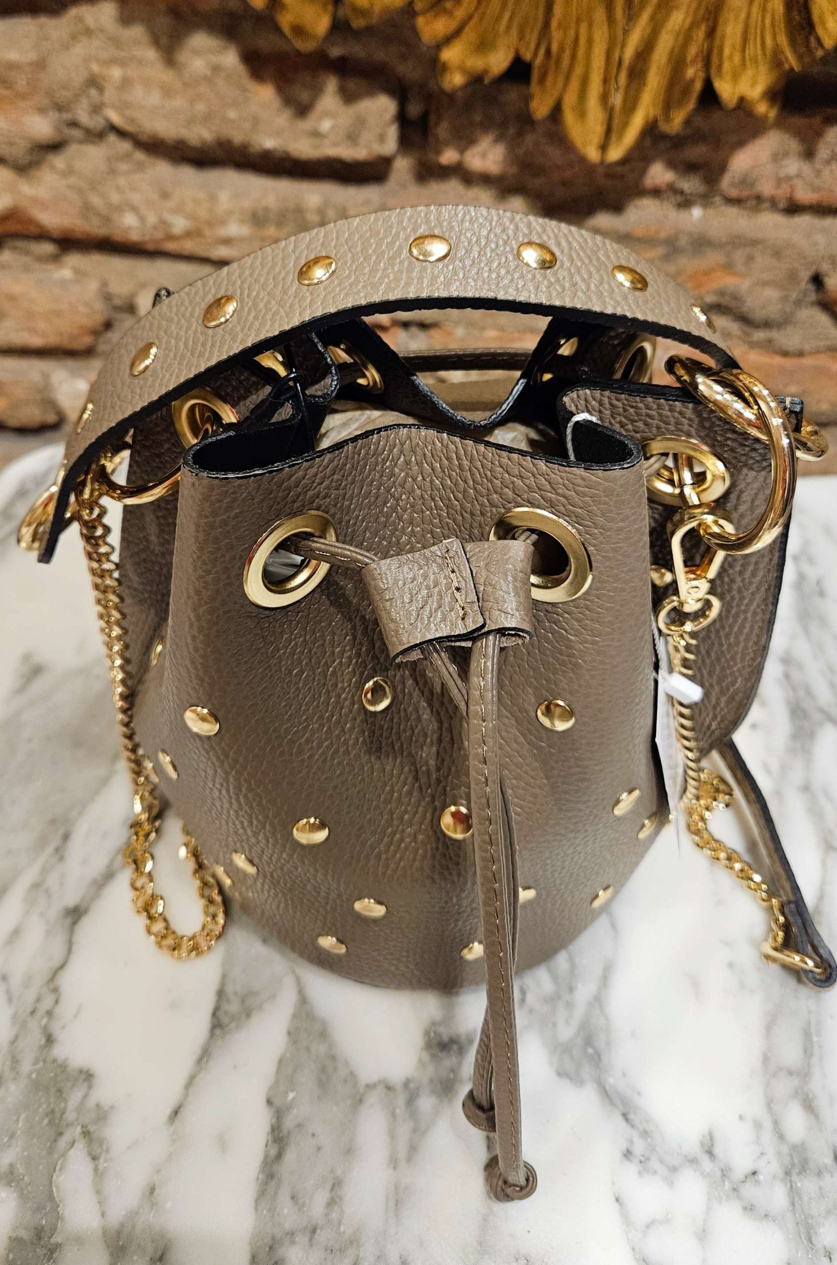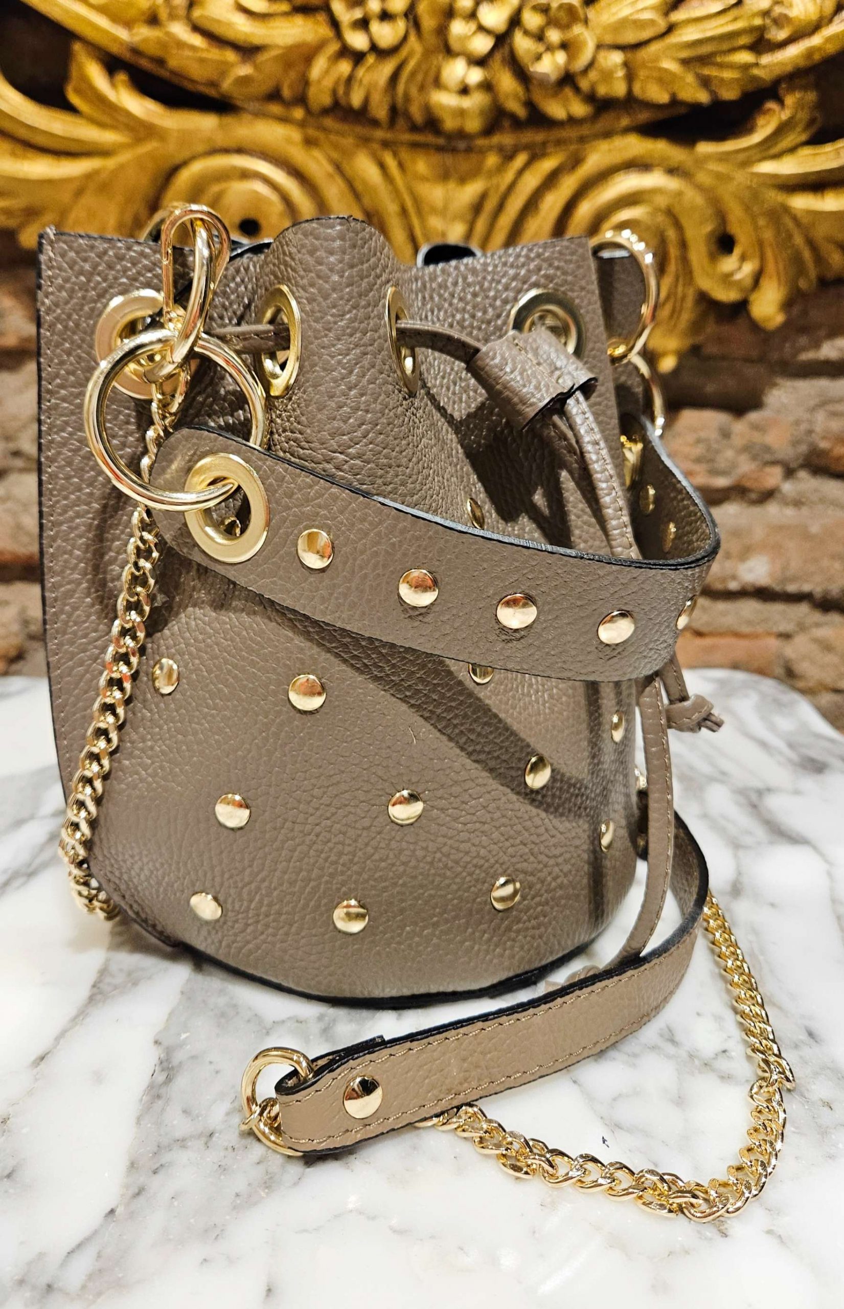 Bolso bombonera, con detalle de tachuelas. Asa corta de mano y opción de asa larga de cadena (no regulable). Cierre en cordón ajustable.