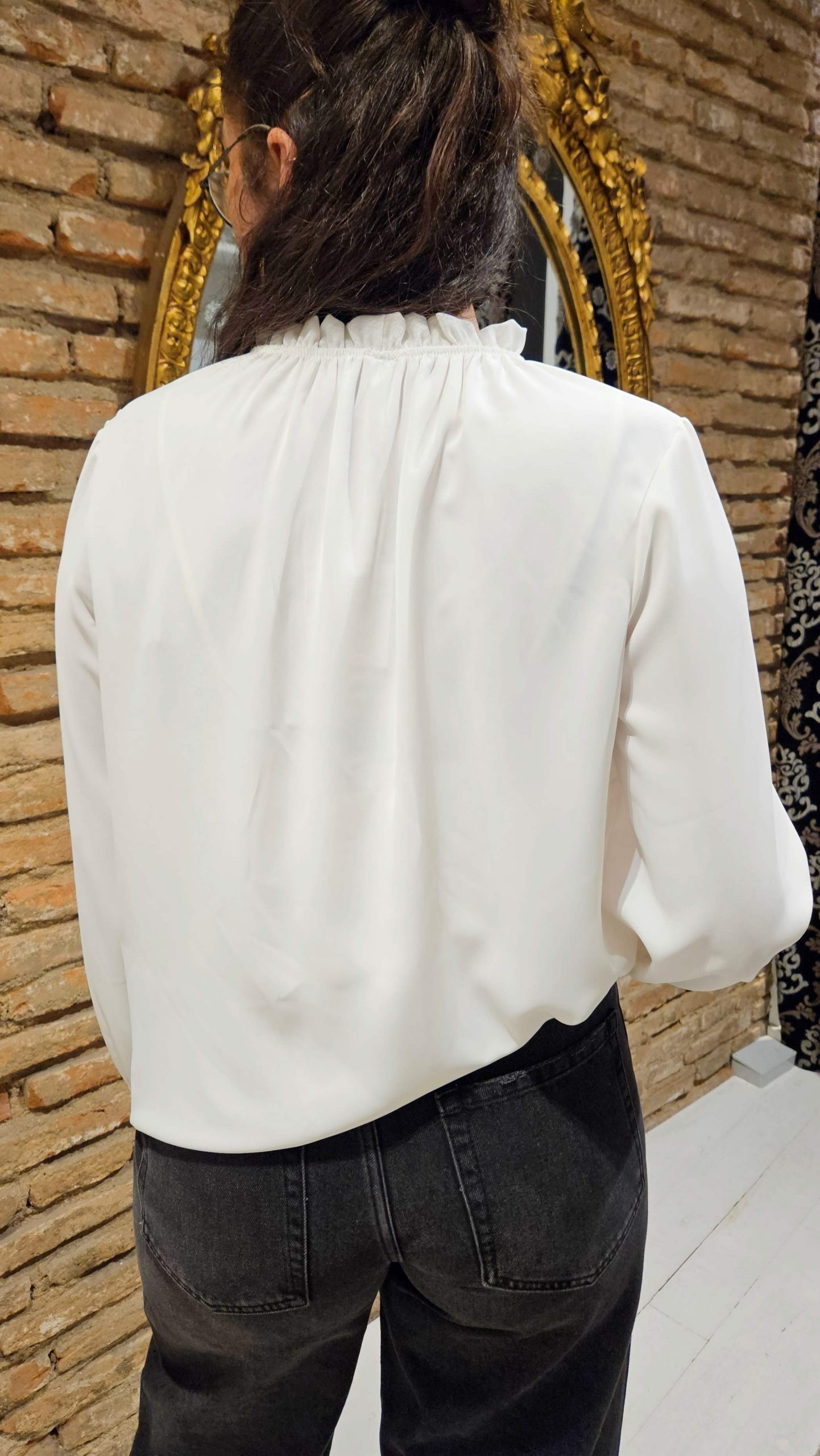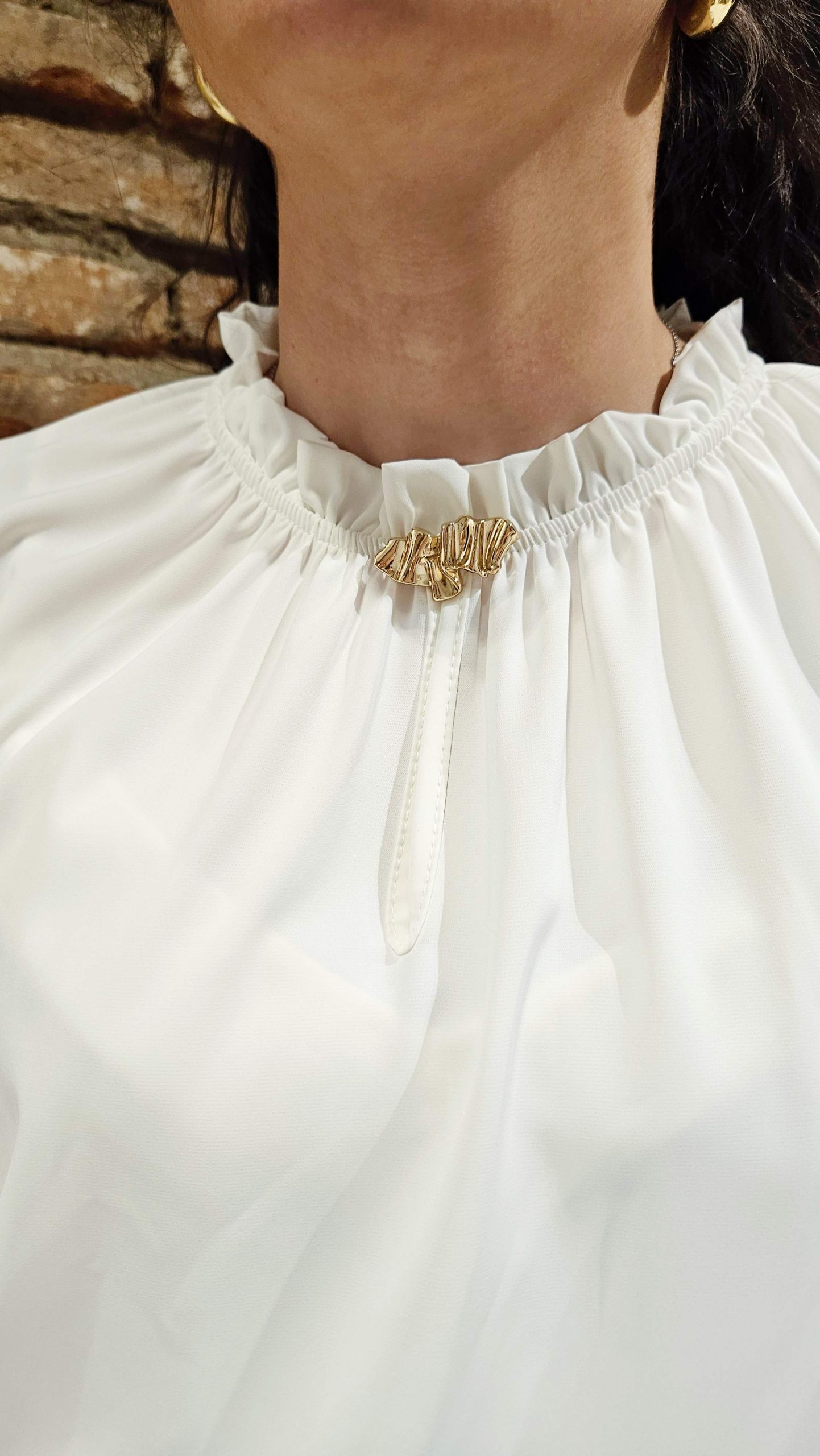 Blusa blanca de manga larga con cuello fruncido y un adorno de pin dorado con forma de lazo. Este estilo es versátil, adecuado tanto para looks de diario como para ocasiones mas formales.