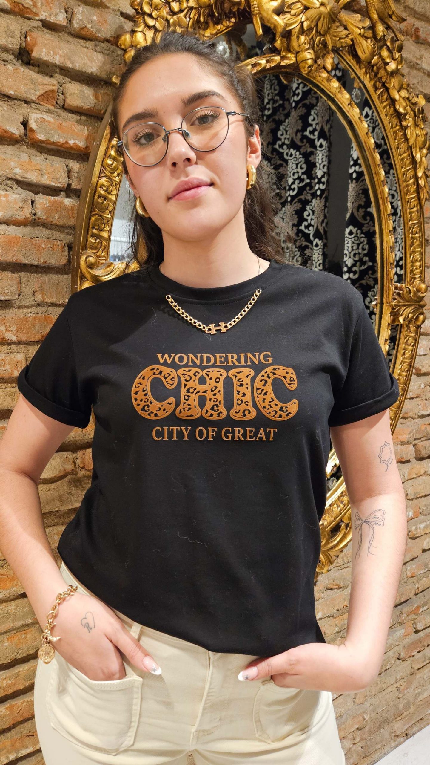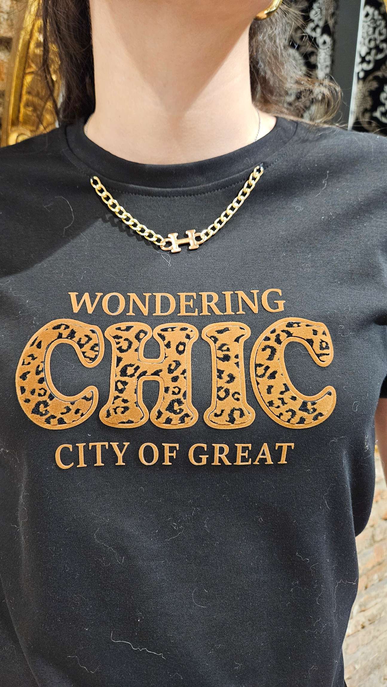 Camiseta básica en color negro con la frase «WONDERING CHIC CITY OF GREAT»  con una cadena dorada en el cuello con la letra H.