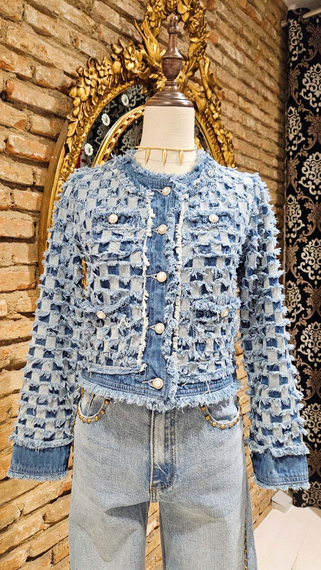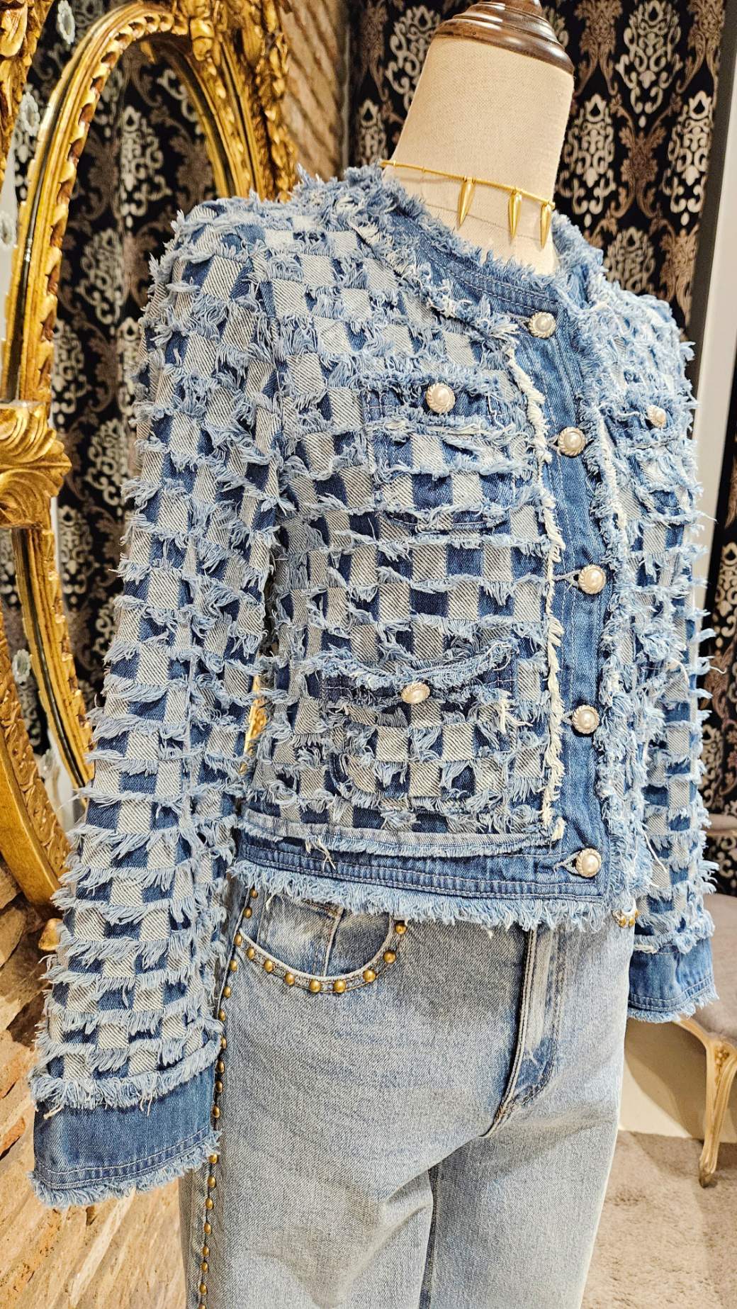 Chaqueta de estilo urbano con un diseño único de cuadros en denim. Presenta un acabado deshilachado que le da un toque moderno y atrevido. Diseño de cuadros en dos tonos de azul. Detalle de tejido deshilachado en los bordes y bolsillos. Cierre frontal con botones joya.