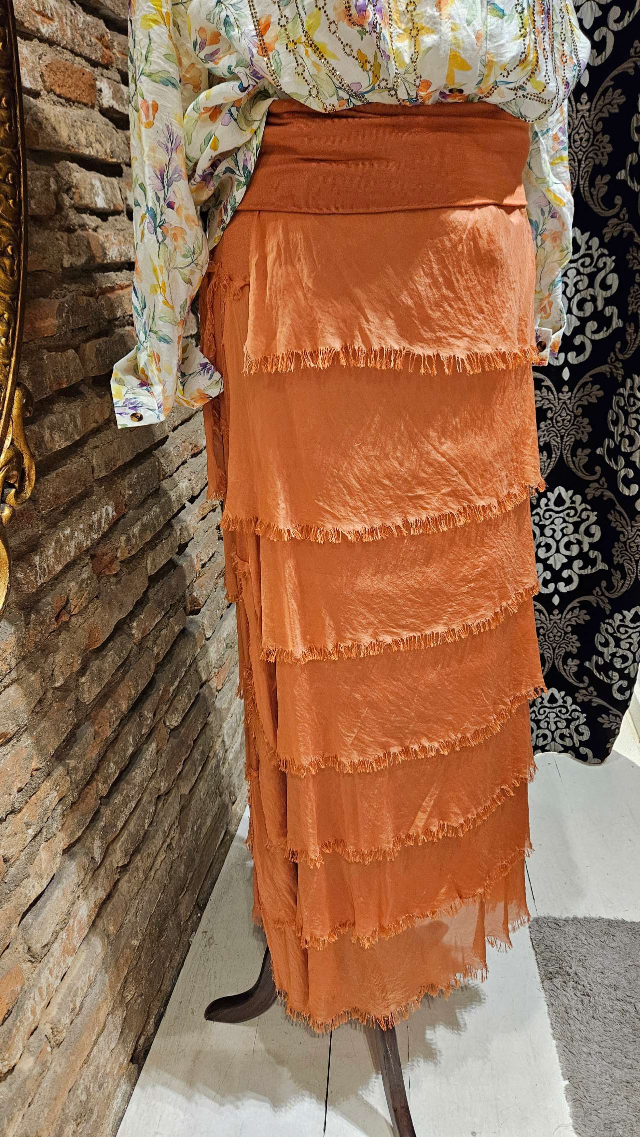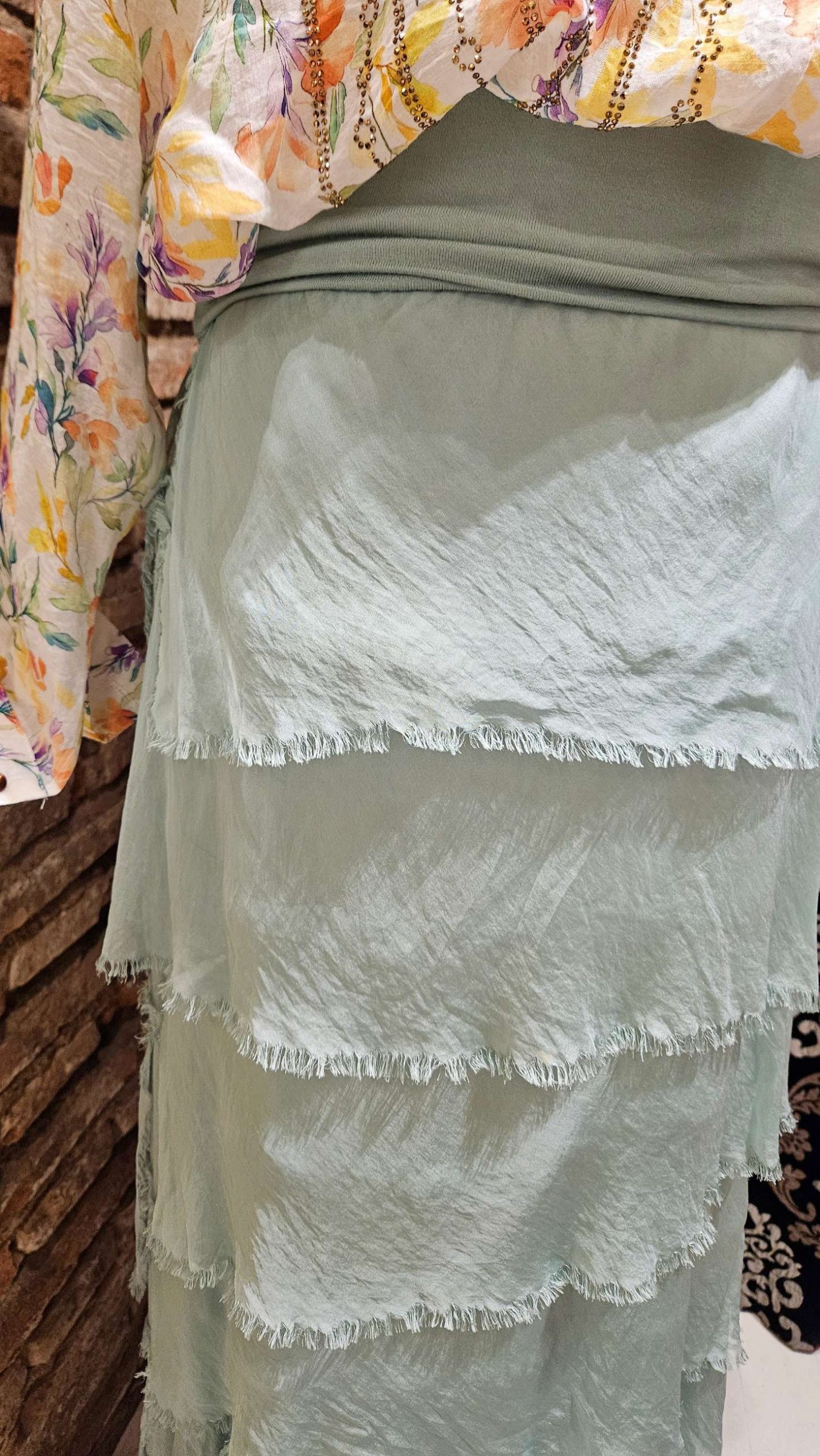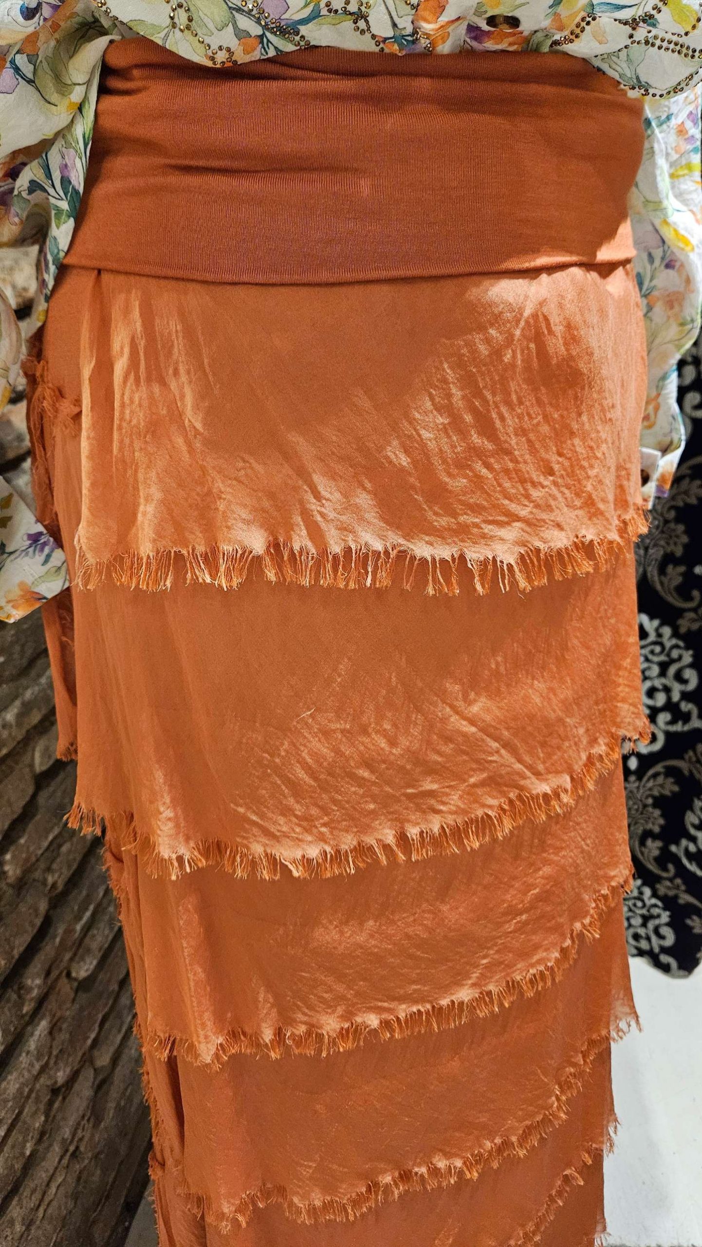 Falda larga de seda estilo boho con un toque hippie, cintura regulable elástica por lo que puedes utilizarla en distintas alturas, e inclusive llegar a utilizarla como vestido. Los volantes le dan un aire bohemio chic a la par de elegante. Se adapta al cuerpo y es muy favorecedora.