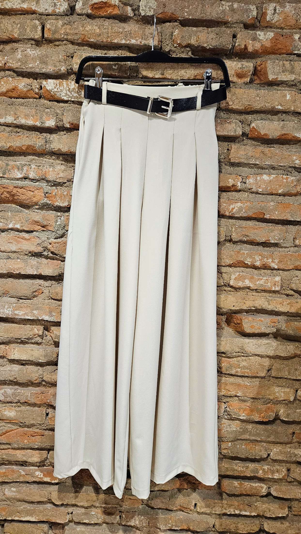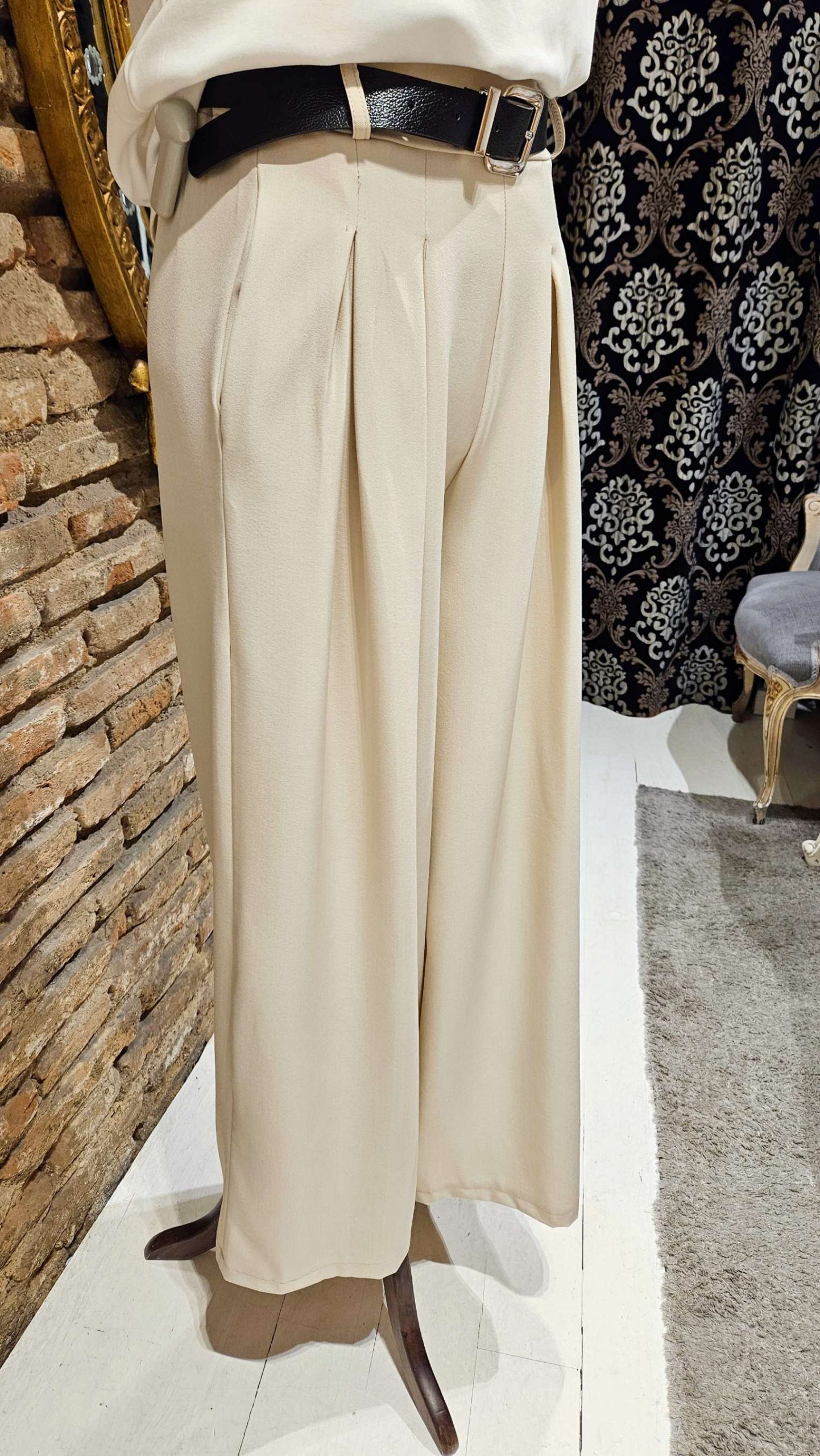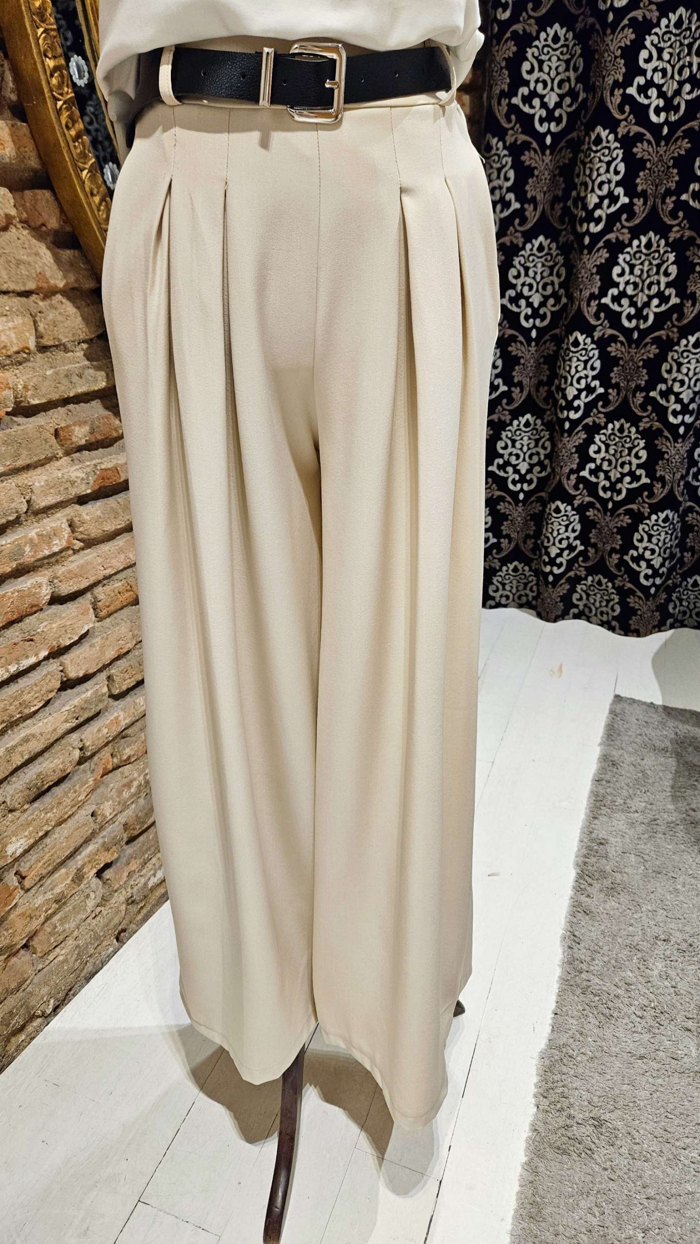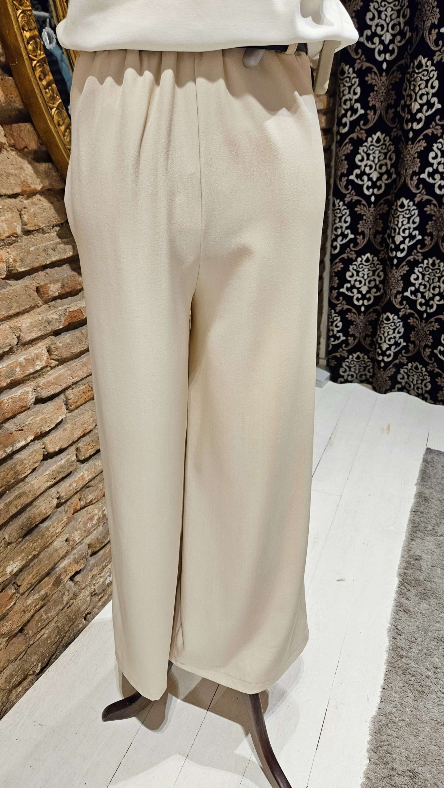 Pantalón palazzo beige, corte amplio y fluido que estiliza la figura y aporta movimiento, cinturilla elástica en la parte trasera que te asegura un ajuste perfecto y cómodo. Ideal para combinar con camisa o camiseta básica. Conviértelo en tu fondo de armario. Bolsillos laterales y cinturón incluido.