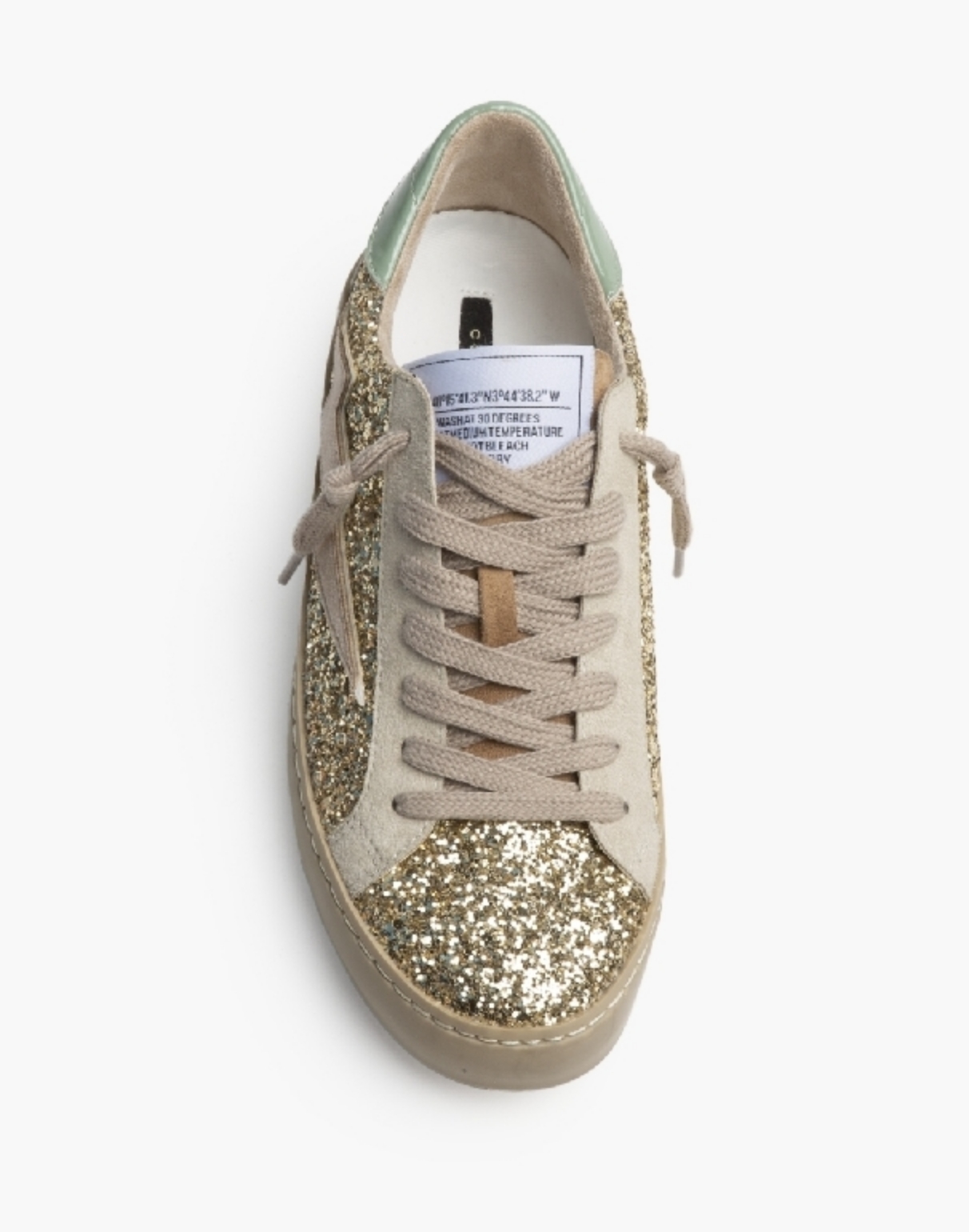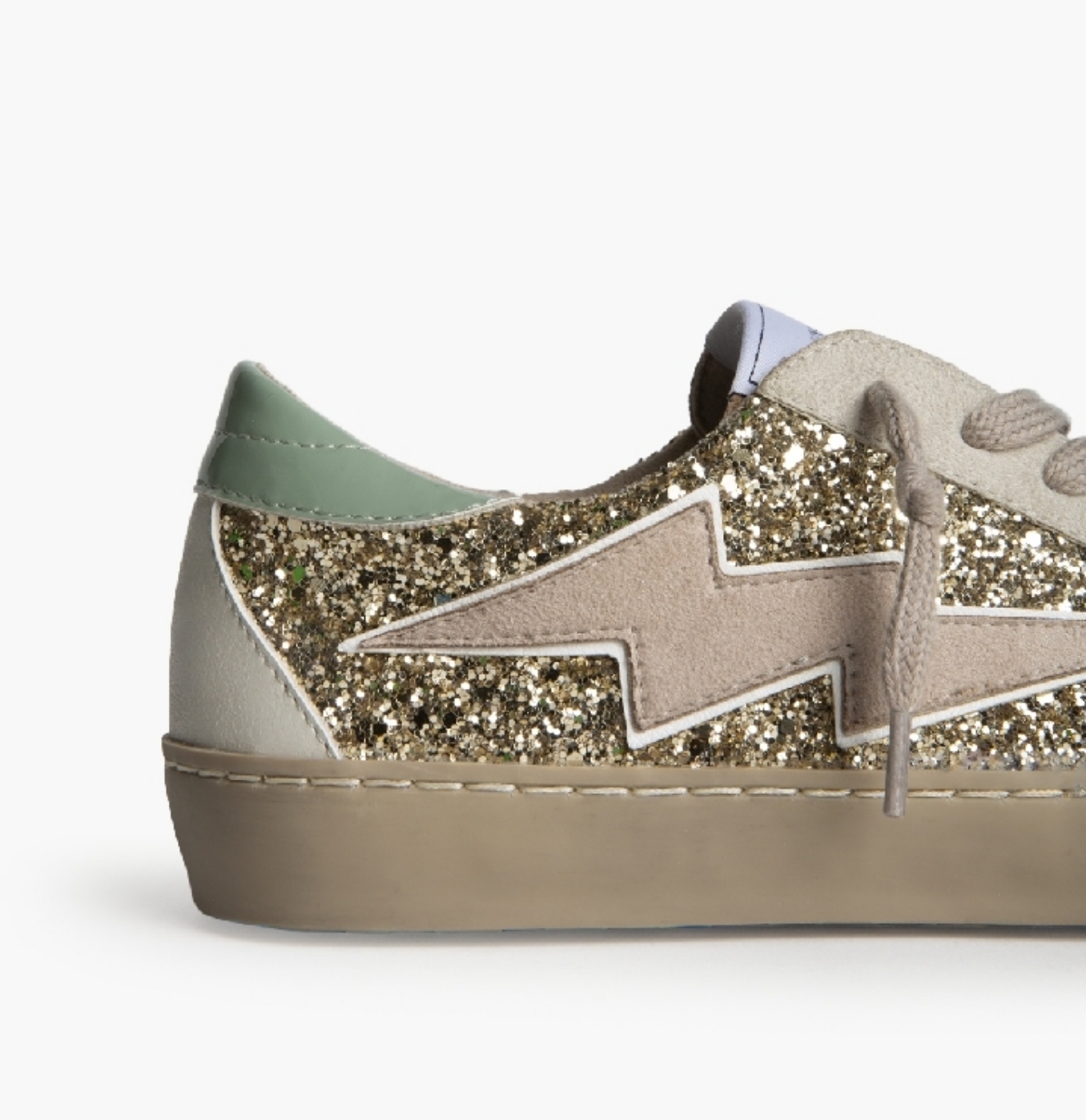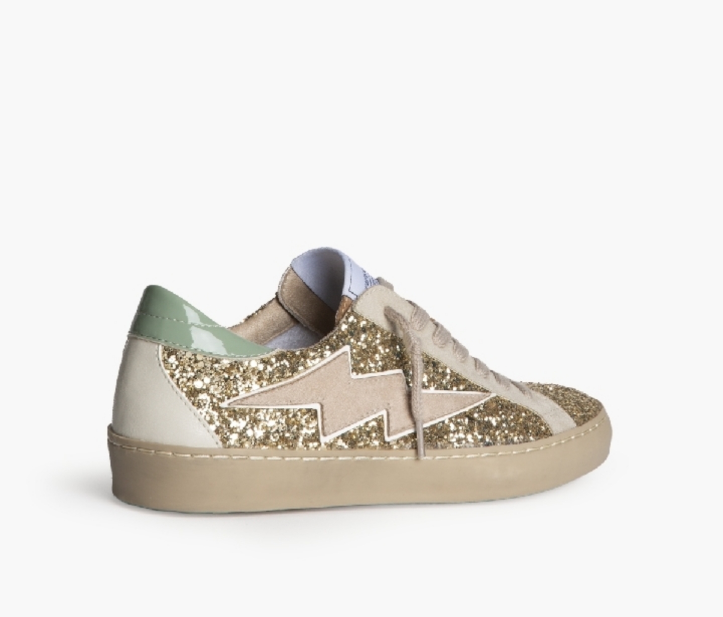 Sneakers urbanas con acabado glitter, diseño low-top y cierre con cordones. Incorporan detalle lateral en forma de rayo, forro interior cómodo y suela de goma de color caramelo. Un modelo moderno, cómodo y fácil de combinar para el día a día. Cierre mediante cordones de siete pasadas.
