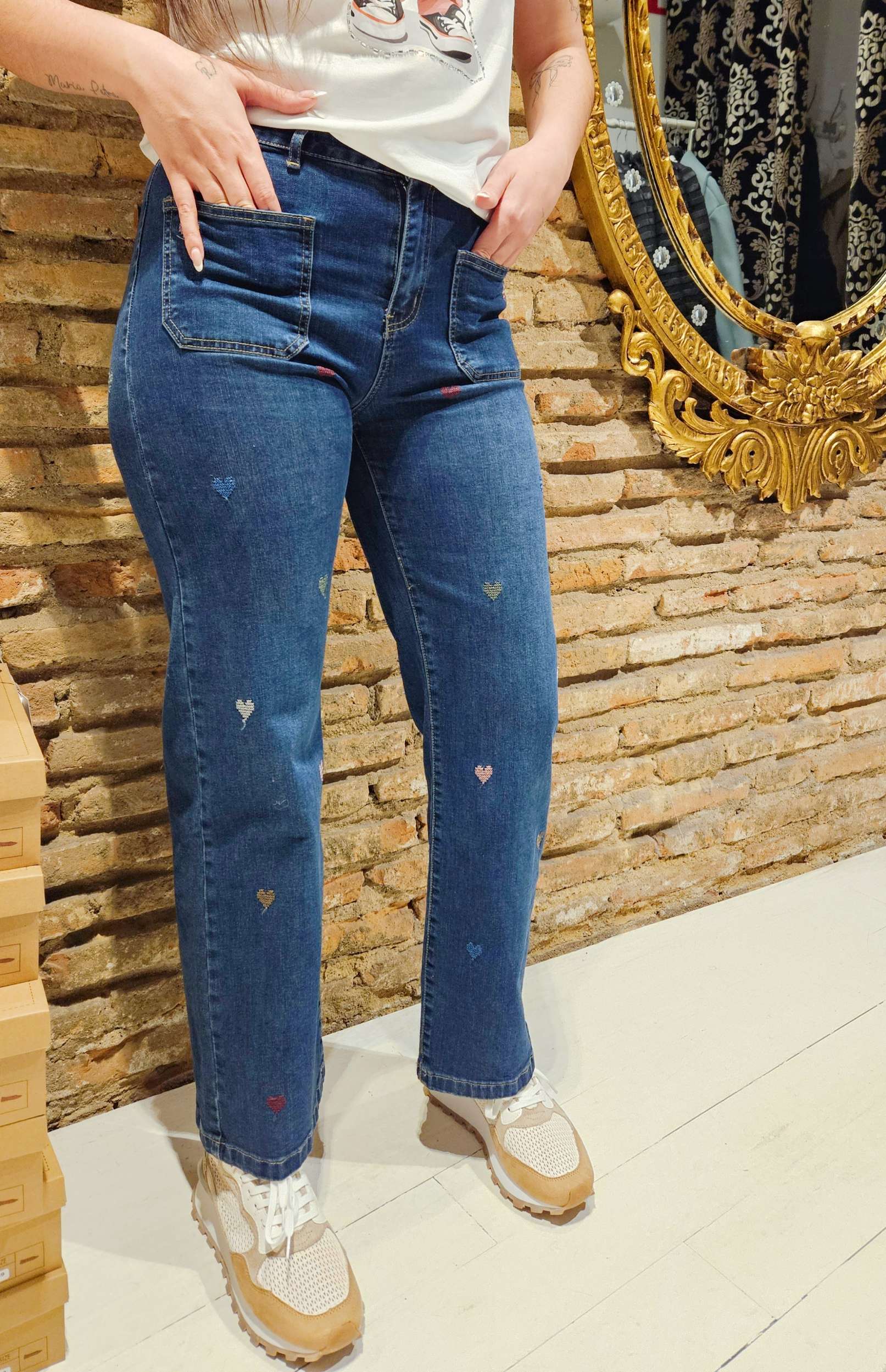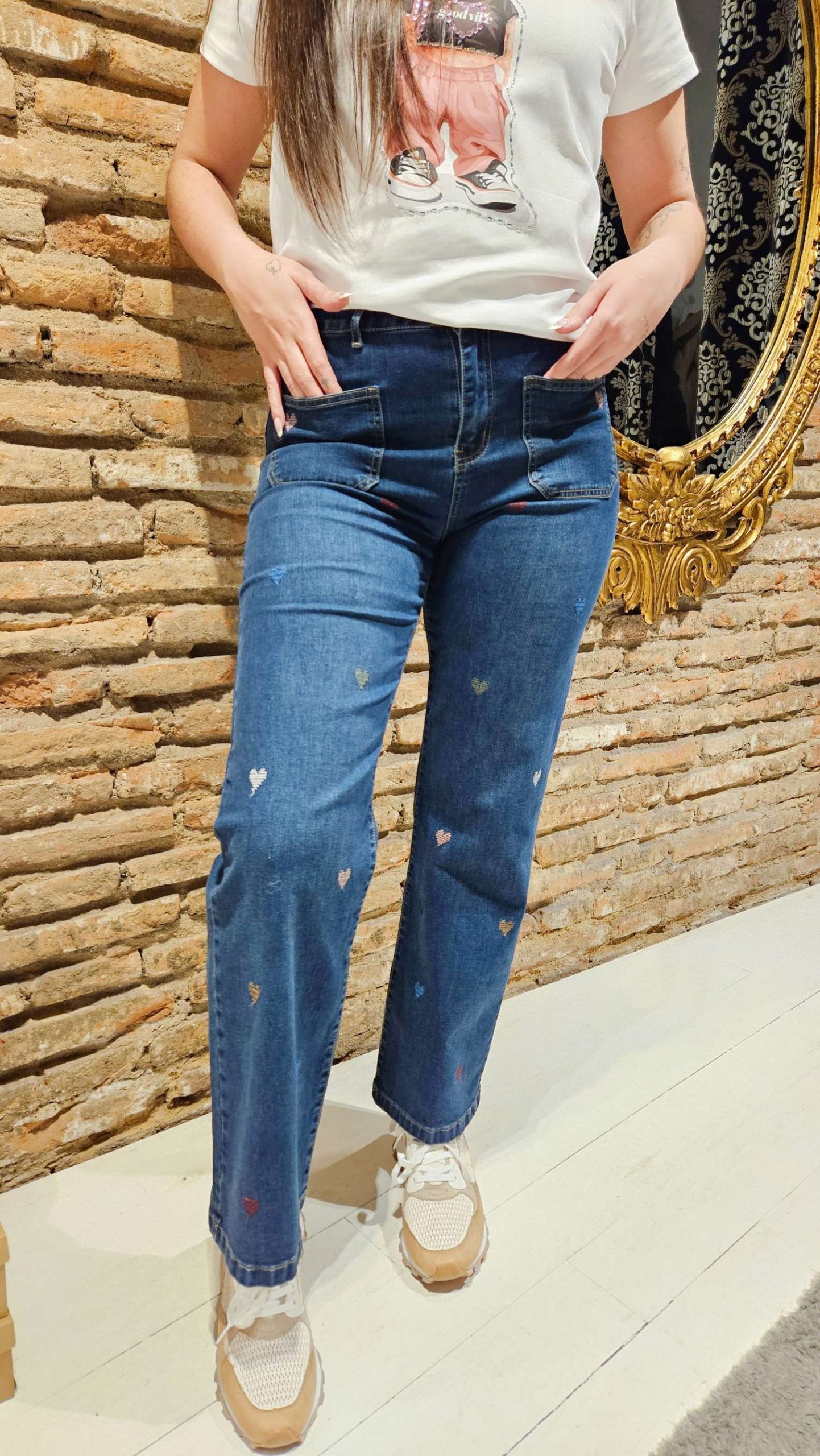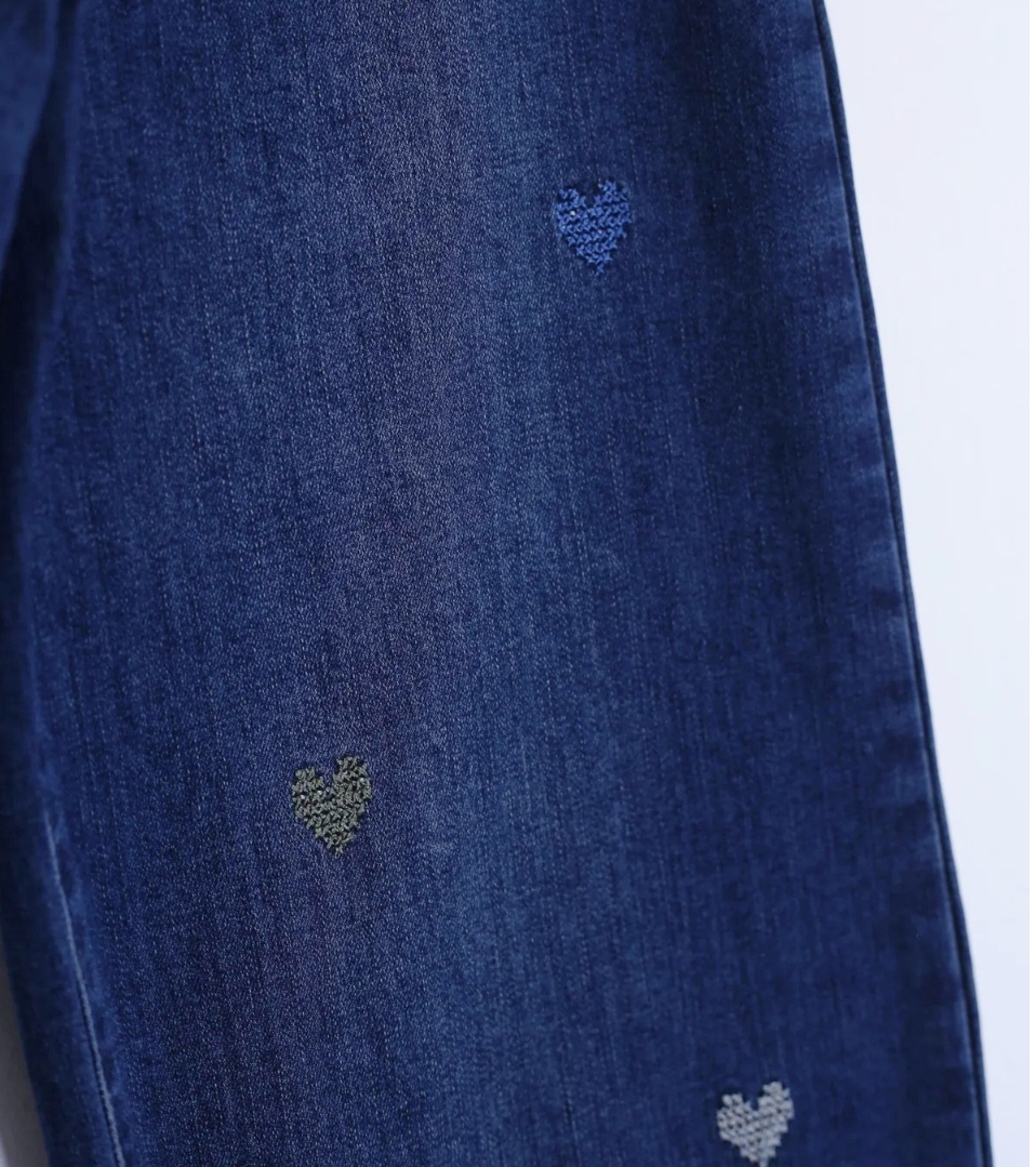 Jeans de tiro alto con pierna ancha. Cierre frontal con cremallera y botón. Dos bolsillos de plastón delanteros y dos traseros. Detalle de bordados en forma de corazón.